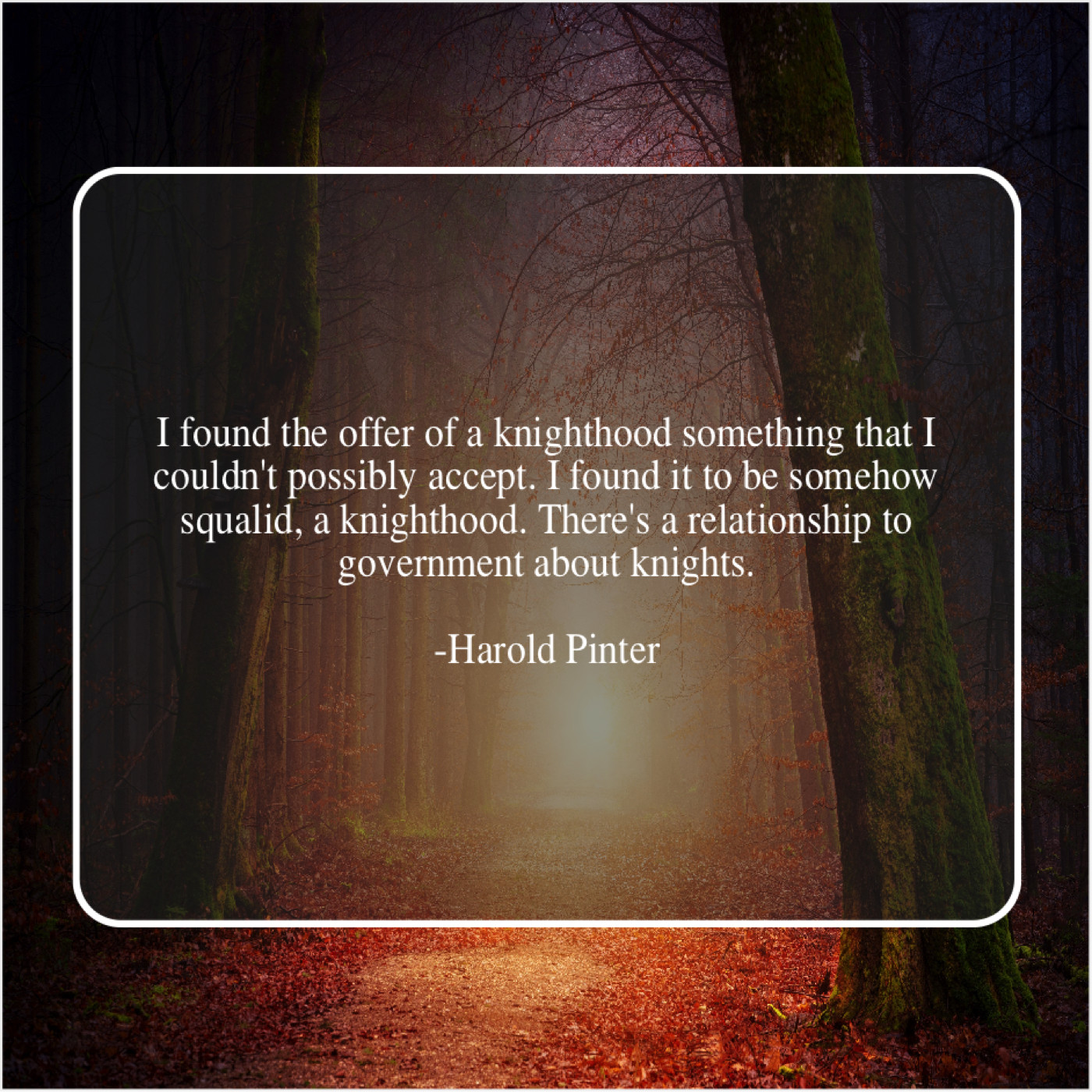 Harold Pinter Harold Pinter – I found the offer of… June 1, 2019 admin “I found the offer of a knighthood something that I couldn’t possibly accept. I found it to be somehow squalid, a knighthood. There’s a relationship to government about knights.”-Harold Pinter