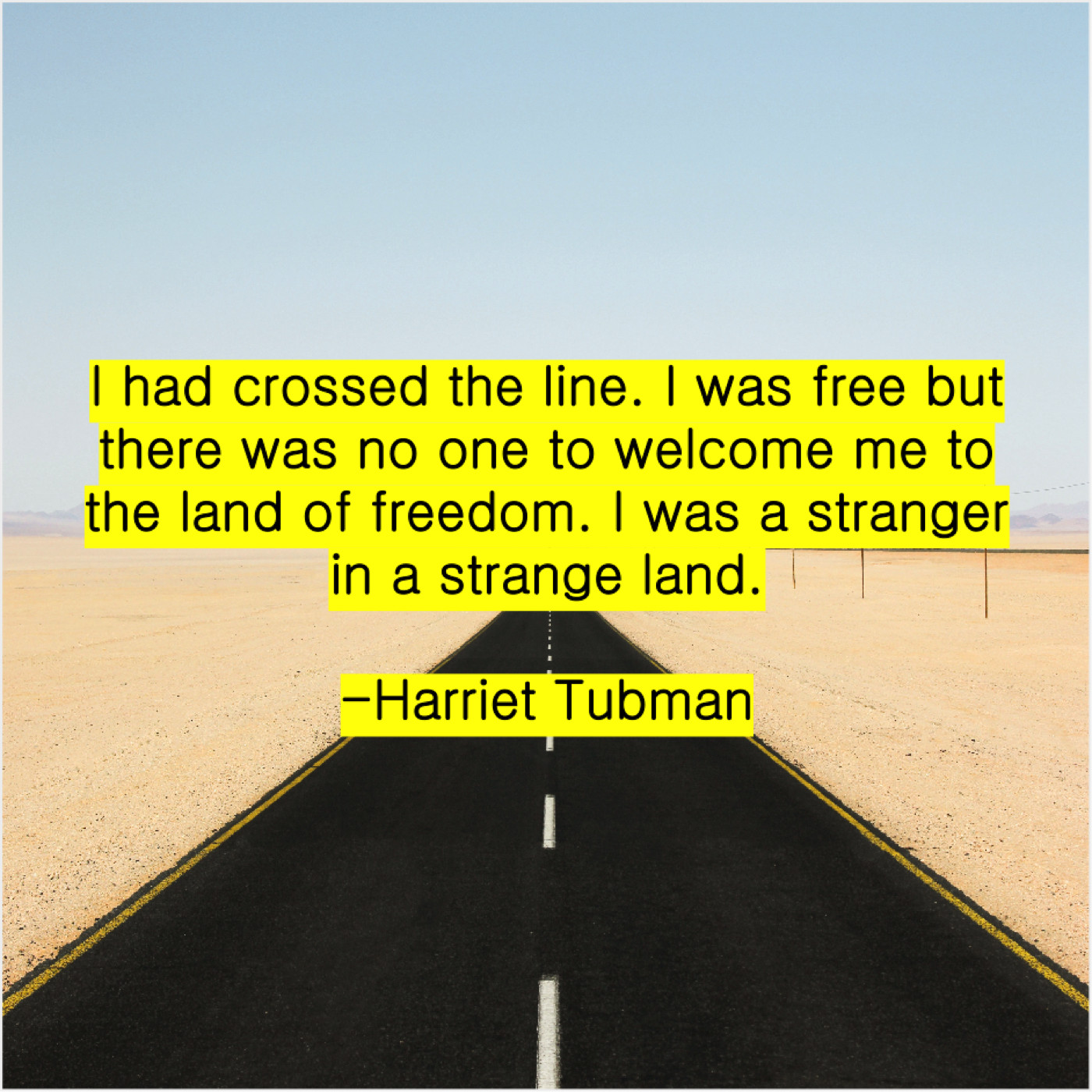 Harriet Tubman Harriet Tubman – I had crossed the line… April 5, 2019 admin “I had crossed the line. I was free but there was no one to welcome me to the land of freedom. I was a stranger in a strange land.”-Harriet Tubman