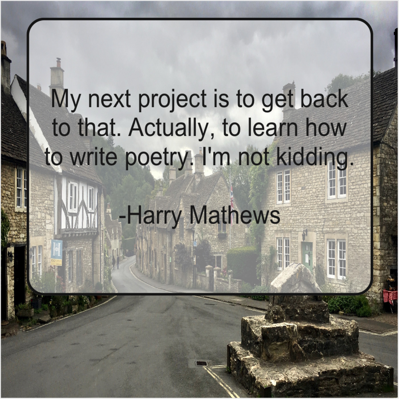 Harry Mathews Harry Mathews – My next project is to… March 20, 2019 admin “My next project is to get back to that. Actually, to learn how to write poetry. I’m not kidding.”-Harry Mathews