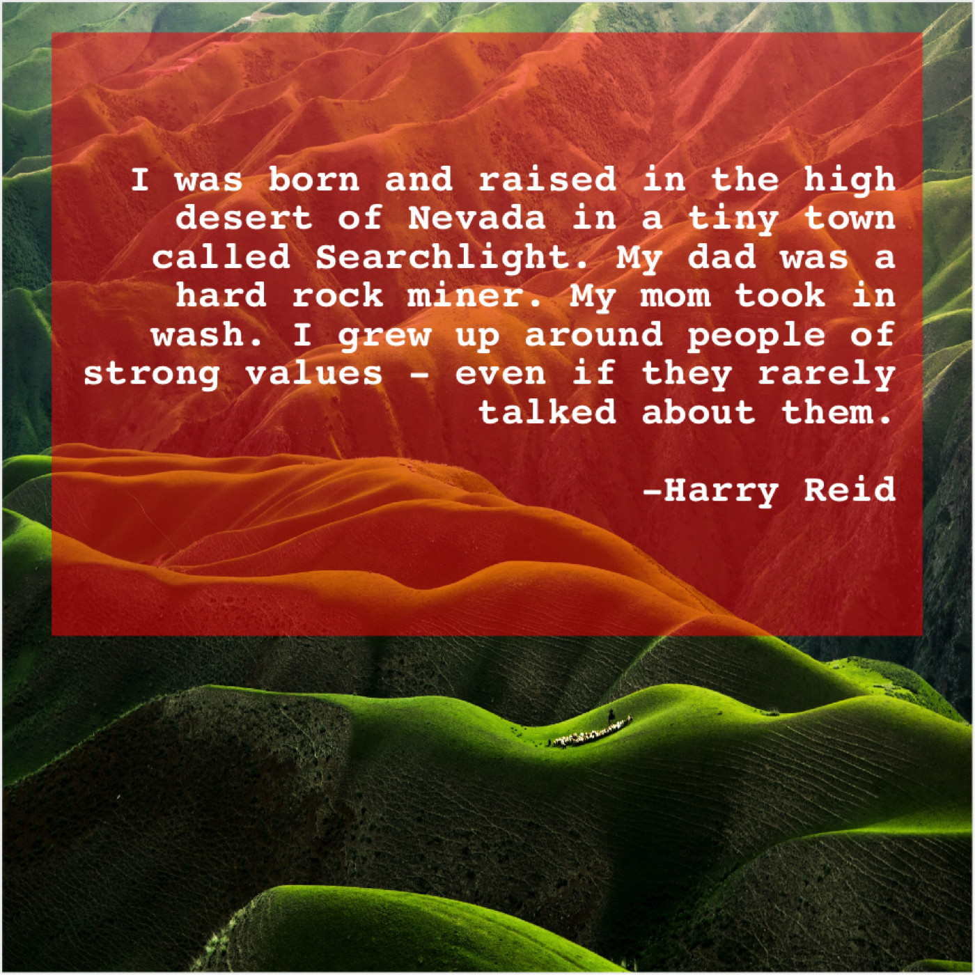 Harry Reid Harry Reid – I was born and raised… December 21, 2018 admin “I was born and raised in the high desert of Nevada in a tiny town called Searchlight. My dad was a hard rock miner. My mom took in wash. I grew up around people of strong values – even if they rarely talked about them.”-Harry Reid