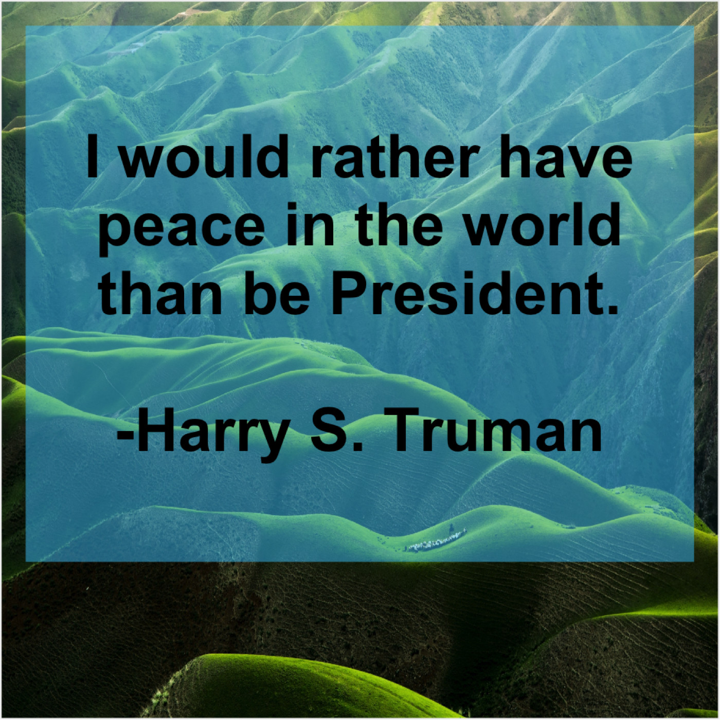Harry S. Truman Harry S. Truman – I would rather have peace… May 9, 2019 admin “I would rather have peace in the world than be President.”-Harry S. Truman