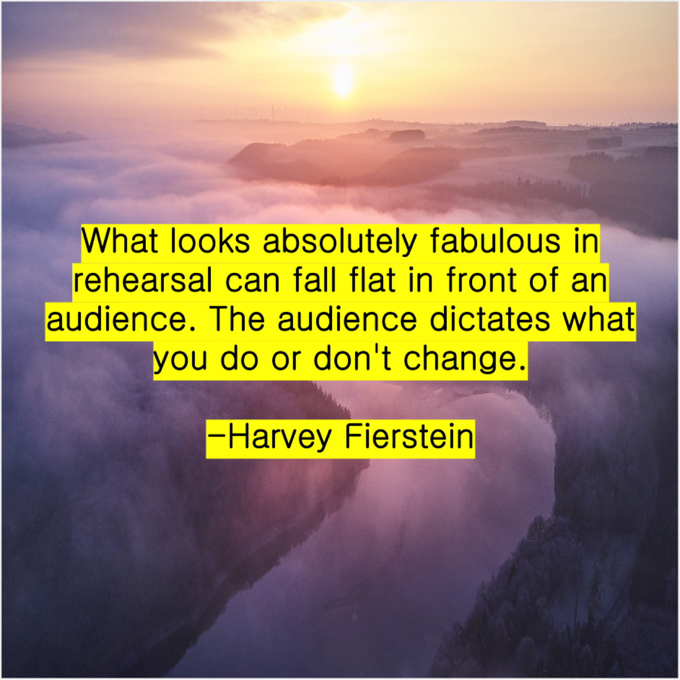 Harvey Fierstein Harvey Fierstein – What looks absolutely fabulous in… September 2, 2019 admin “What looks absolutely fabulous in rehearsal can fall flat in front of an audience. The audience dictates what you do or don’t change.”-Harvey Fierstein