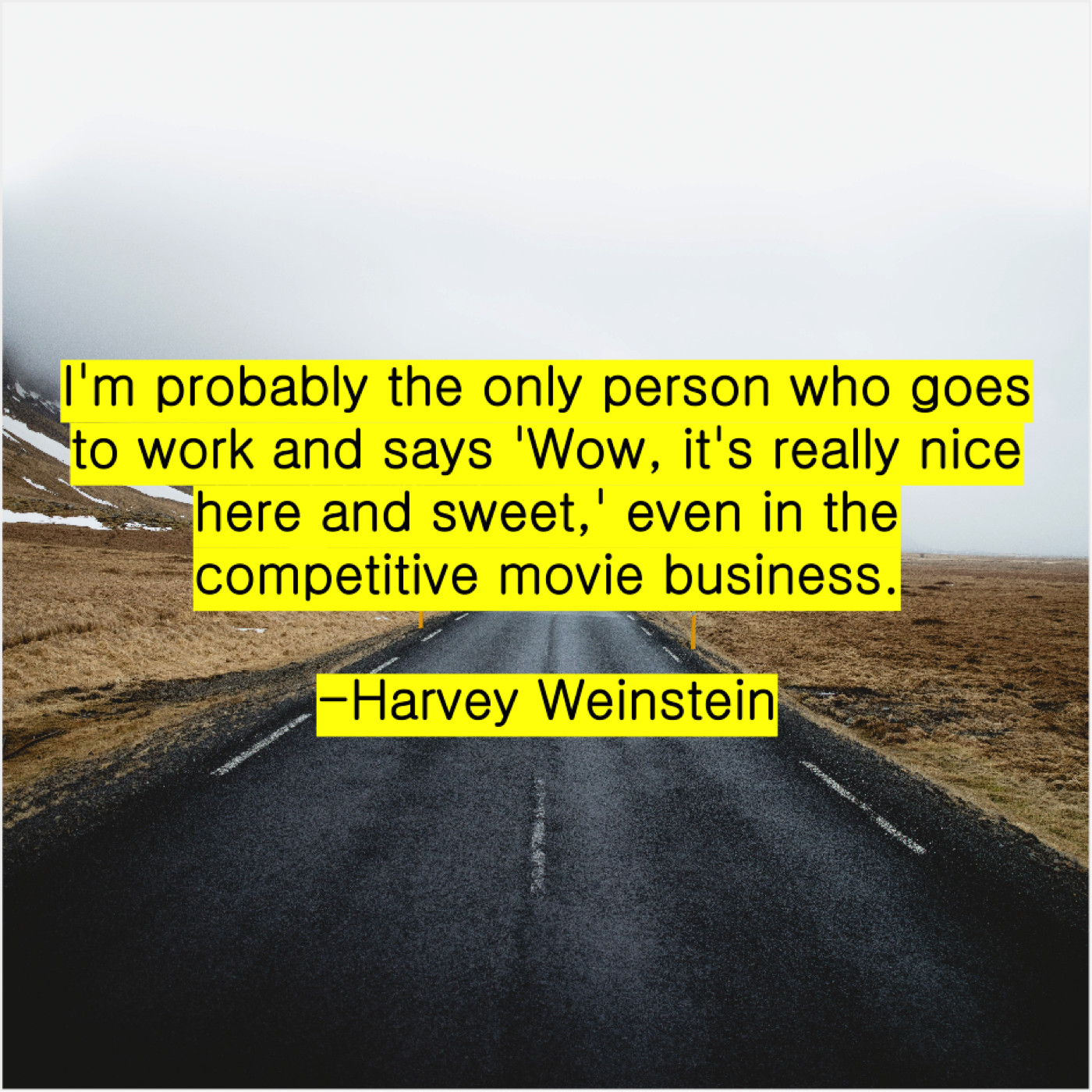 Harvey Weinstein Harvey Weinstein – I’m probably the only person… May 2, 2019 admin “I’m probably the only person who goes to work and says ‘Wow, it’s really nice here and sweet,’ even in the competitive movie business.”-Harvey Weinstein