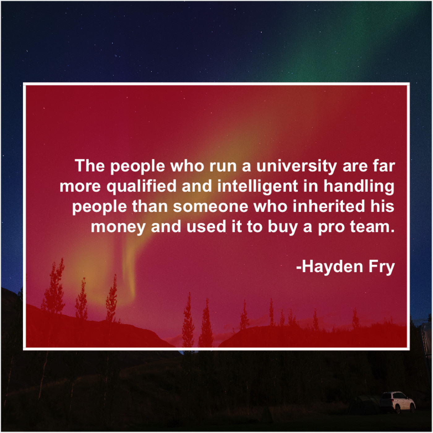 Hayden Fry Hayden Fry – The people who run a… August 19, 2019 admin “The people who run a university are far more qualified and intelligent in handling people than someone who inherited his money and used it to buy a pro team.”-Hayden Fry