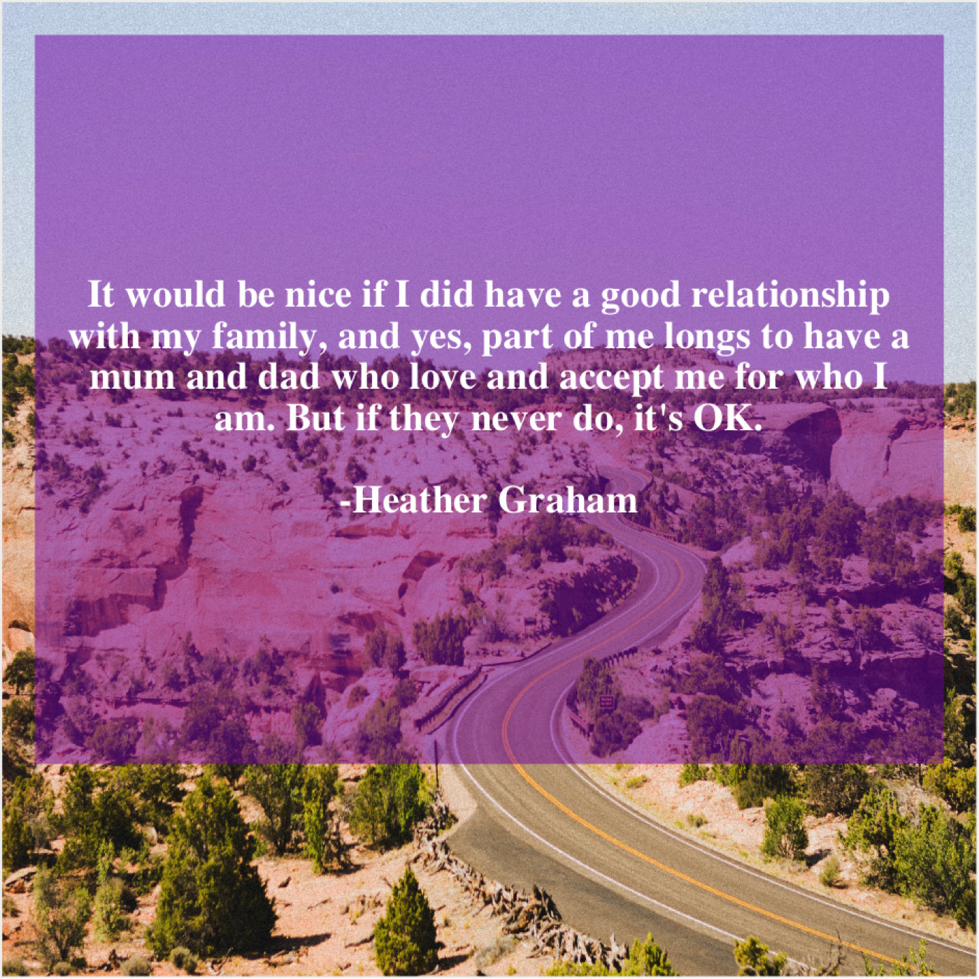 Heather Graham Heather Graham – It would be nice if… July 15, 2019 admin “It would be nice if I did have a good relationship with my family, and yes, part of me longs to have a mum and dad who love and accept me for who I am. But if they never do, it’s OK.”-Heather Graham