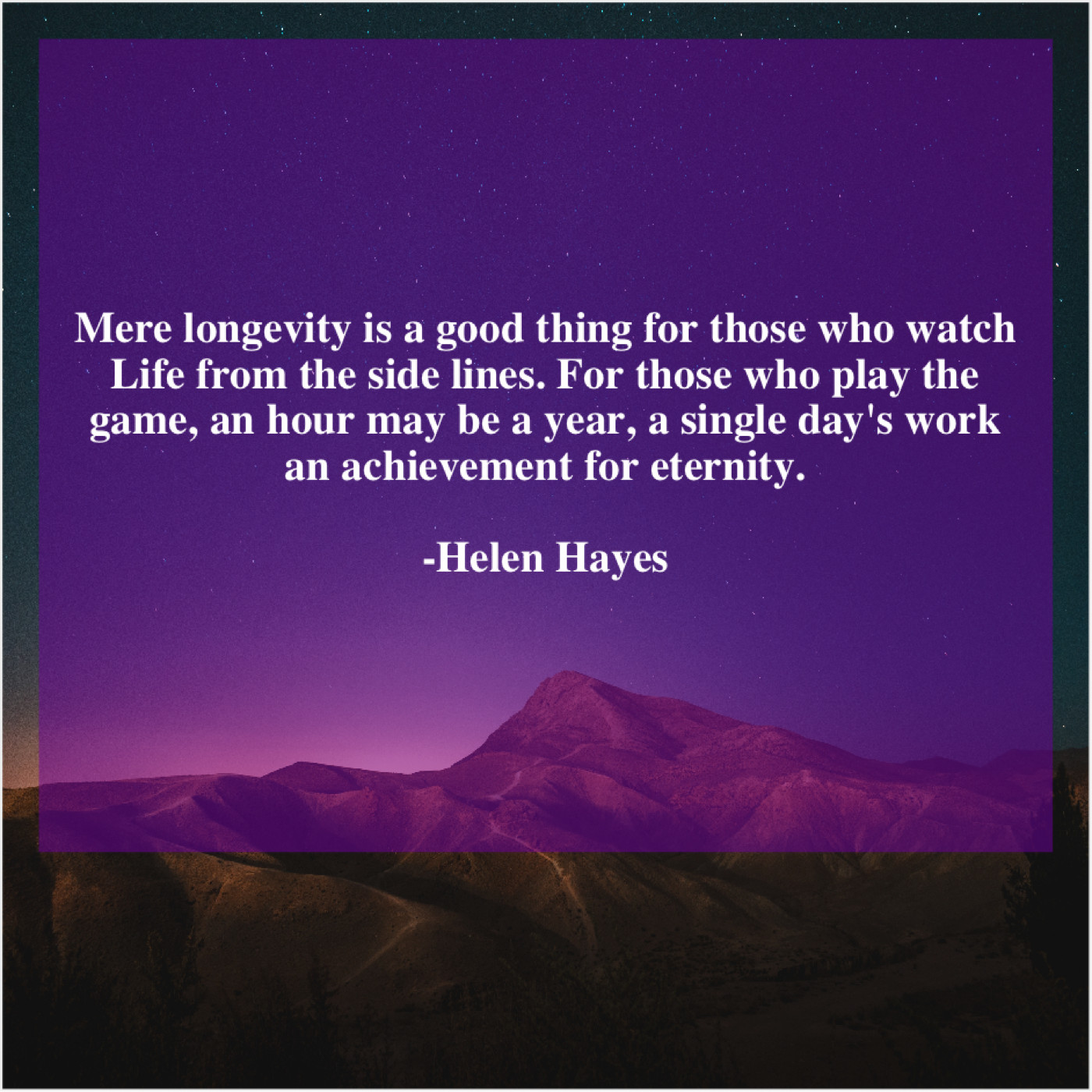 Helen Hayes Helen Hayes – Mere longevity is a good… January 19, 2019 admin “Mere longevity is a good thing for those who watch Life from the side lines. For those who play the game, an hour may be a year, a single day’s work an achievement for eternity.”-Helen Hayes