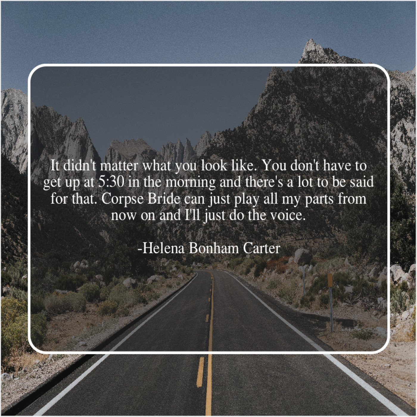 Helena Bonham Carter Helena Bonham Carter – It didn’t matter what you… August 10, 2019 admin “It didn’t matter what you look like. You don’t have to get up at 5:30 in the morning and there’s a lot to be said for that. Corpse Bride can just play all my parts from now on and I’ll just do the voice.”-Helena Bonham Carter