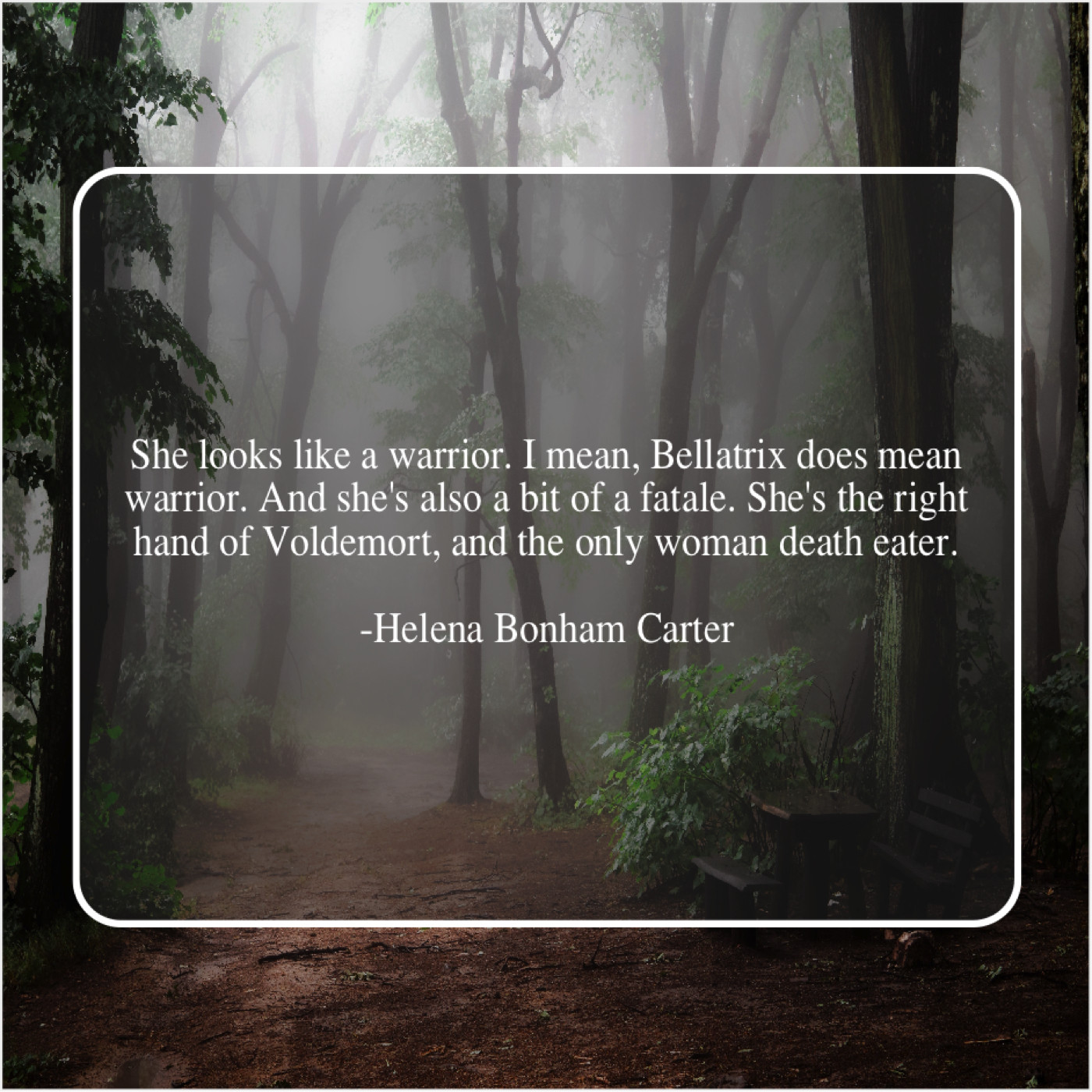 Helena Bonham Carter Helena Bonham Carter – She looks like a warrior… February 1, 2019 admin “She looks like a warrior. I mean, Bellatrix does mean warrior. And she’s also a bit of a fatale. She’s the right hand of Voldemort, and the only woman death eater.”-Helena Bonham Carter