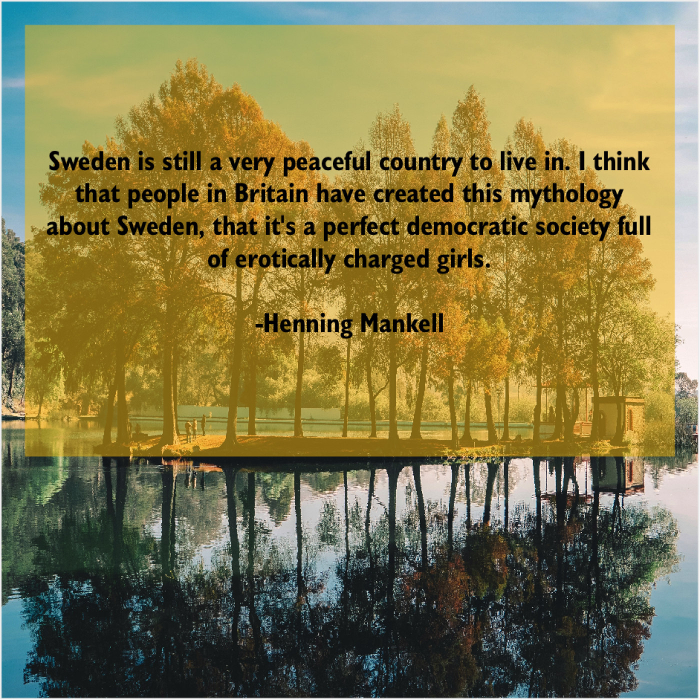 Henning Mankell Henning Mankell – Sweden is still a very… June 8, 2019 admin “Sweden is still a very peaceful country to live in. I think that people in Britain have created this mythology about Sweden, that it’s a perfect democratic society full of erotically charged girls.”-Henning Mankell