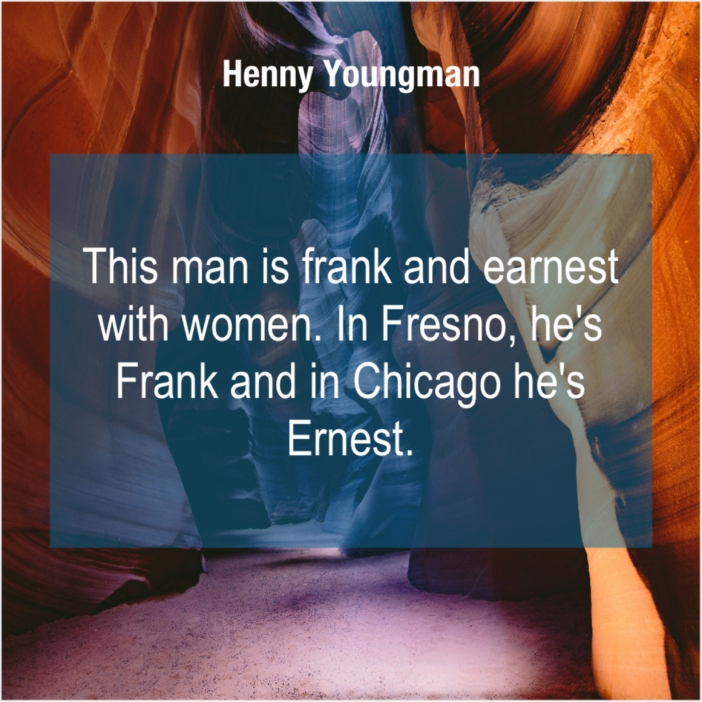 Henny Youngman Henny Youngman – This man is frank and… December 18, 2018 admin “This man is frank and earnest with women. In Fresno, he’s Frank and in Chicago he’s Ernest.”-Henny Youngman