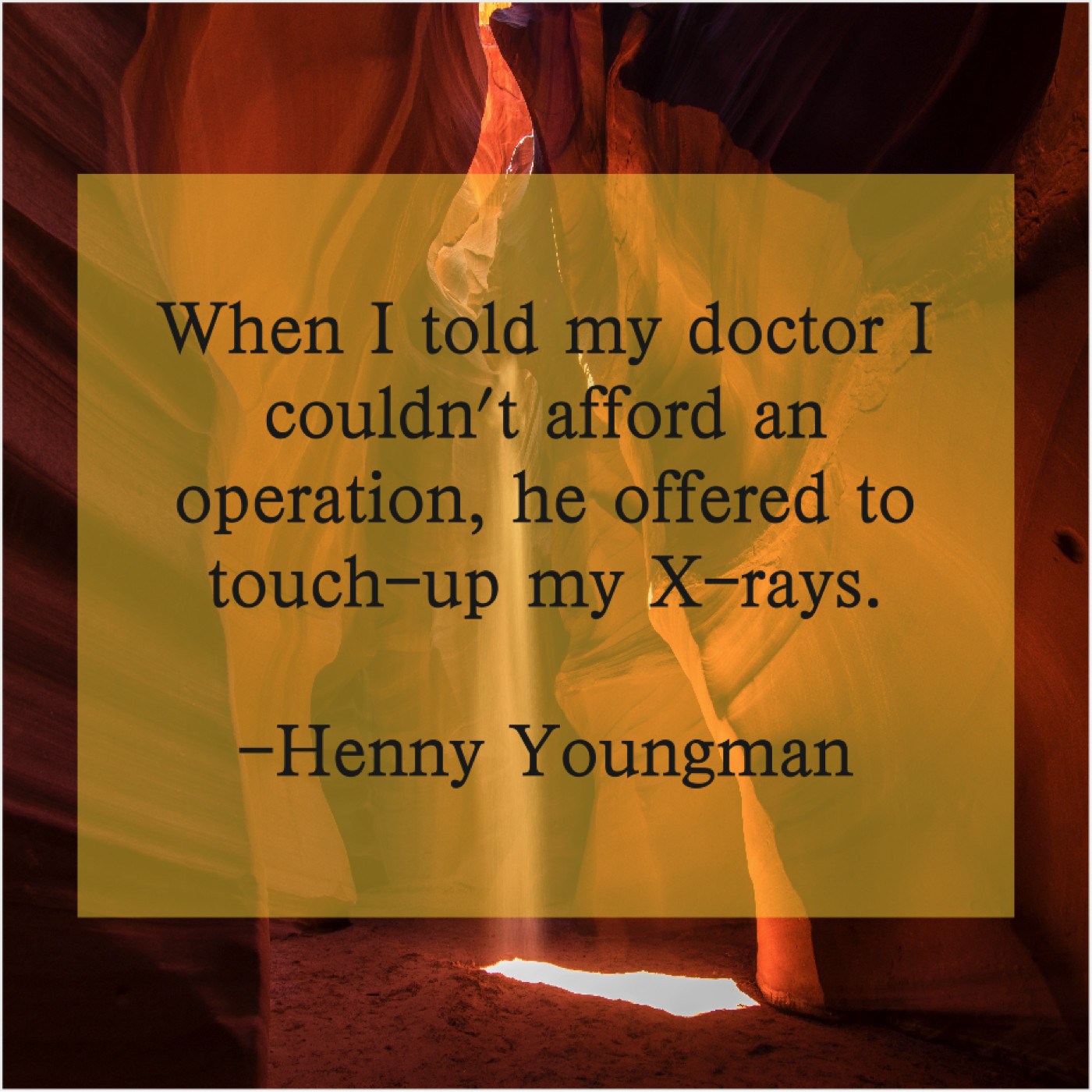 Henny Youngman Henny Youngman – When I told my doctor… January 13, 2019 admin “When I told my doctor I couldn’t afford an operation, he offered to touch-up my X-rays.”-Henny Youngman