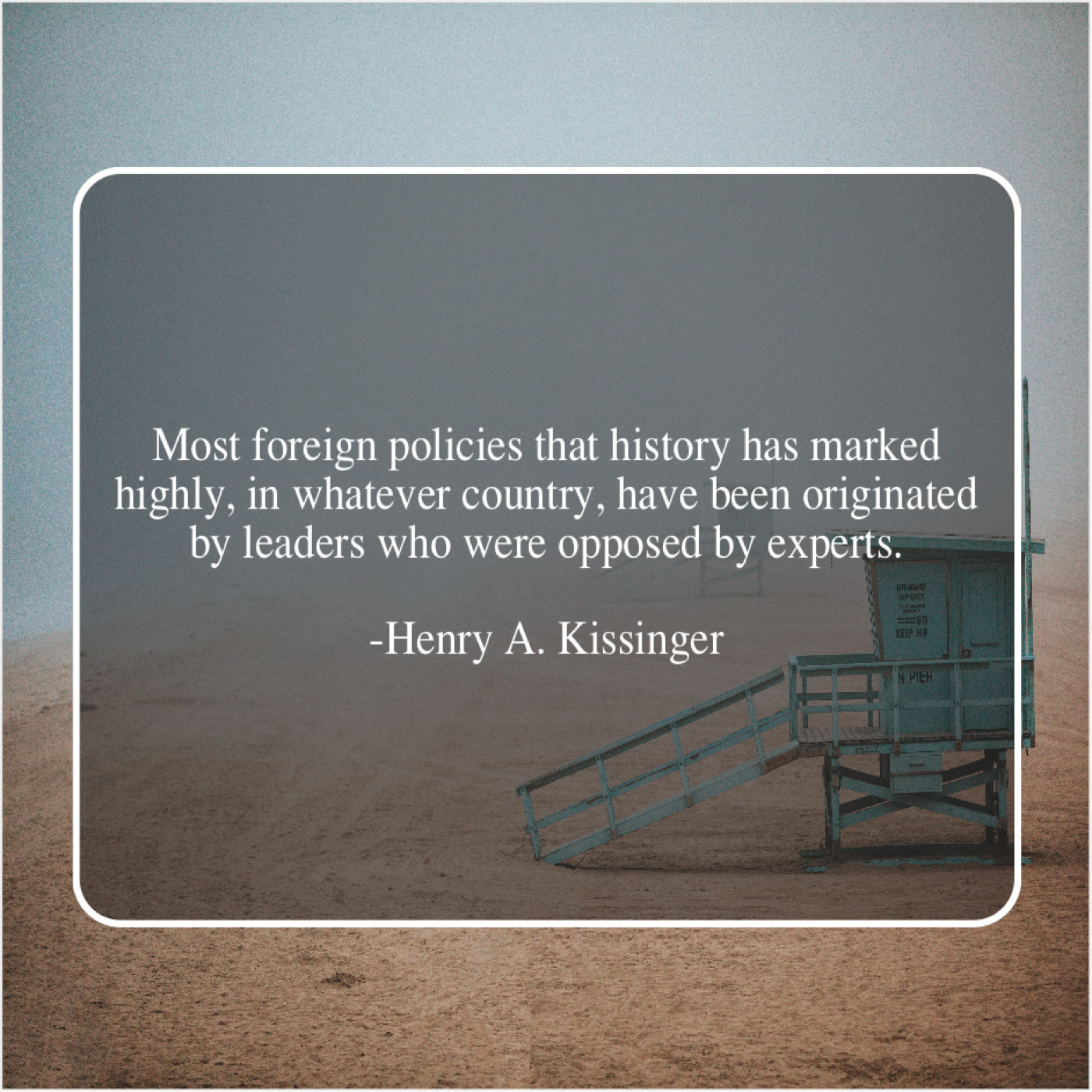 Henry A. Kissinger Henry A. Kissinger – Most foreign policies that history… January 15, 2019 admin “Most foreign policies that history has marked highly, in whatever country, have been originated by leaders who were opposed by experts.”-Henry A. Kissinger