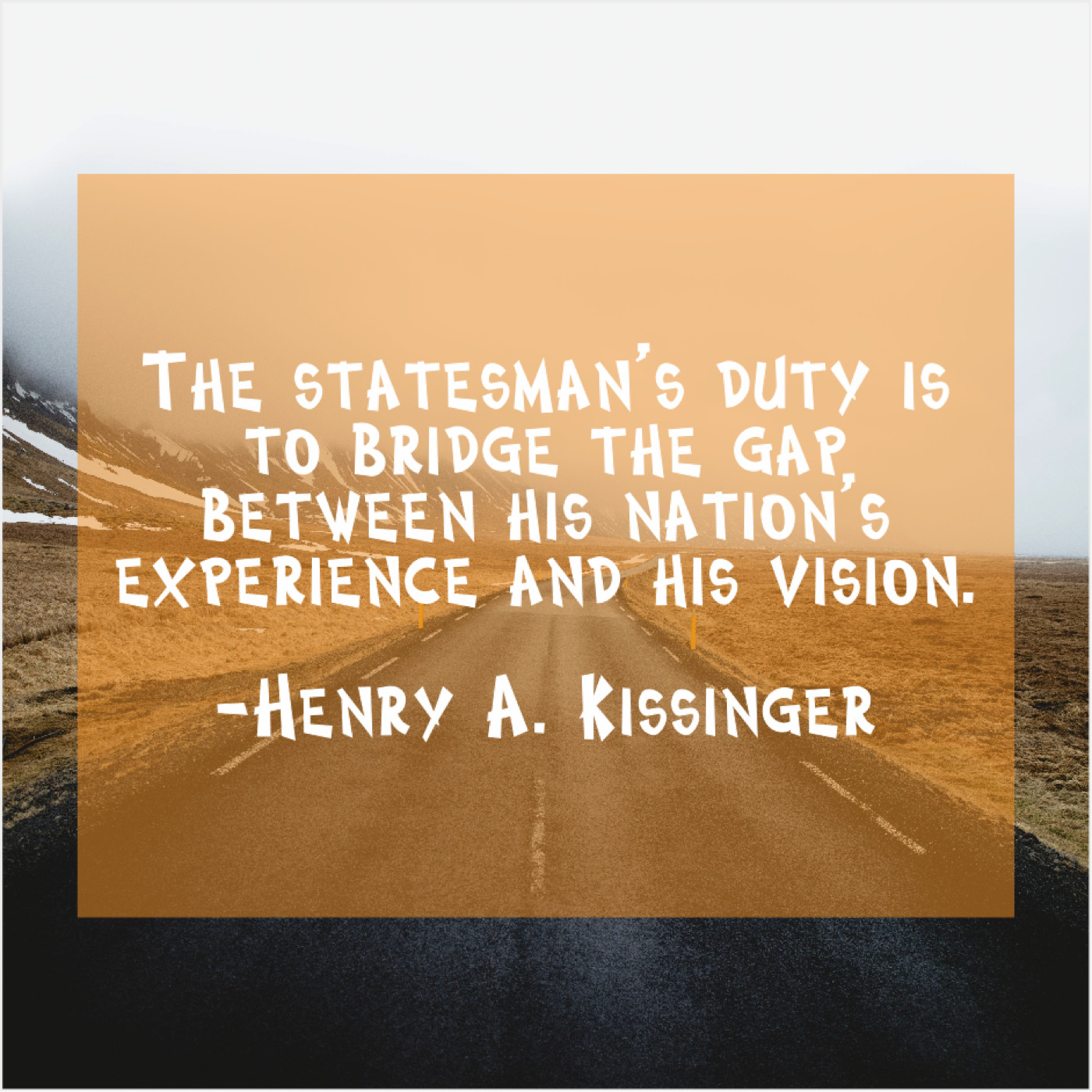 Henry A. Kissinger Henry A. Kissinger – The statesman’s duty is to… September 5, 2019 admin “The statesman’s duty is to bridge the gap between his nation’s experience and his vision.”-Henry A. Kissinger