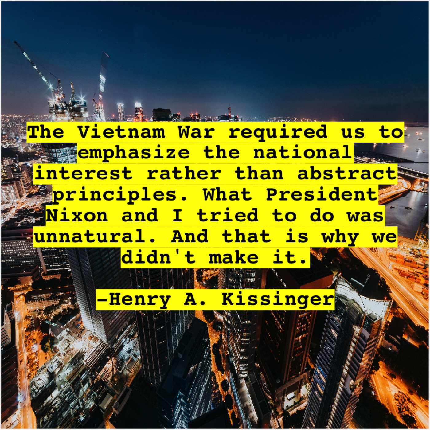 Henry A. Kissinger Henry A. Kissinger – The Vietnam War required us… August 23, 2019 admin “The Vietnam War required us to emphasize the national interest rather than abstract principles. What President Nixon and I tried to do was unnatural. And that is why we didn’t make it.”-Henry A. Kissinger