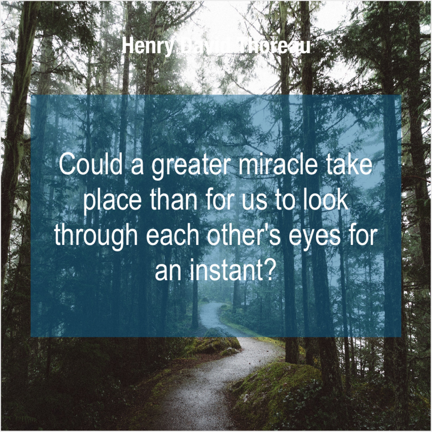 Henry David Thoreau Henry David Thoreau – Could a greater miracle take… October 23, 2019 admin “Could a greater miracle take place than for us to look through each other’s eyes for an instant?”-Henry David Thoreau
