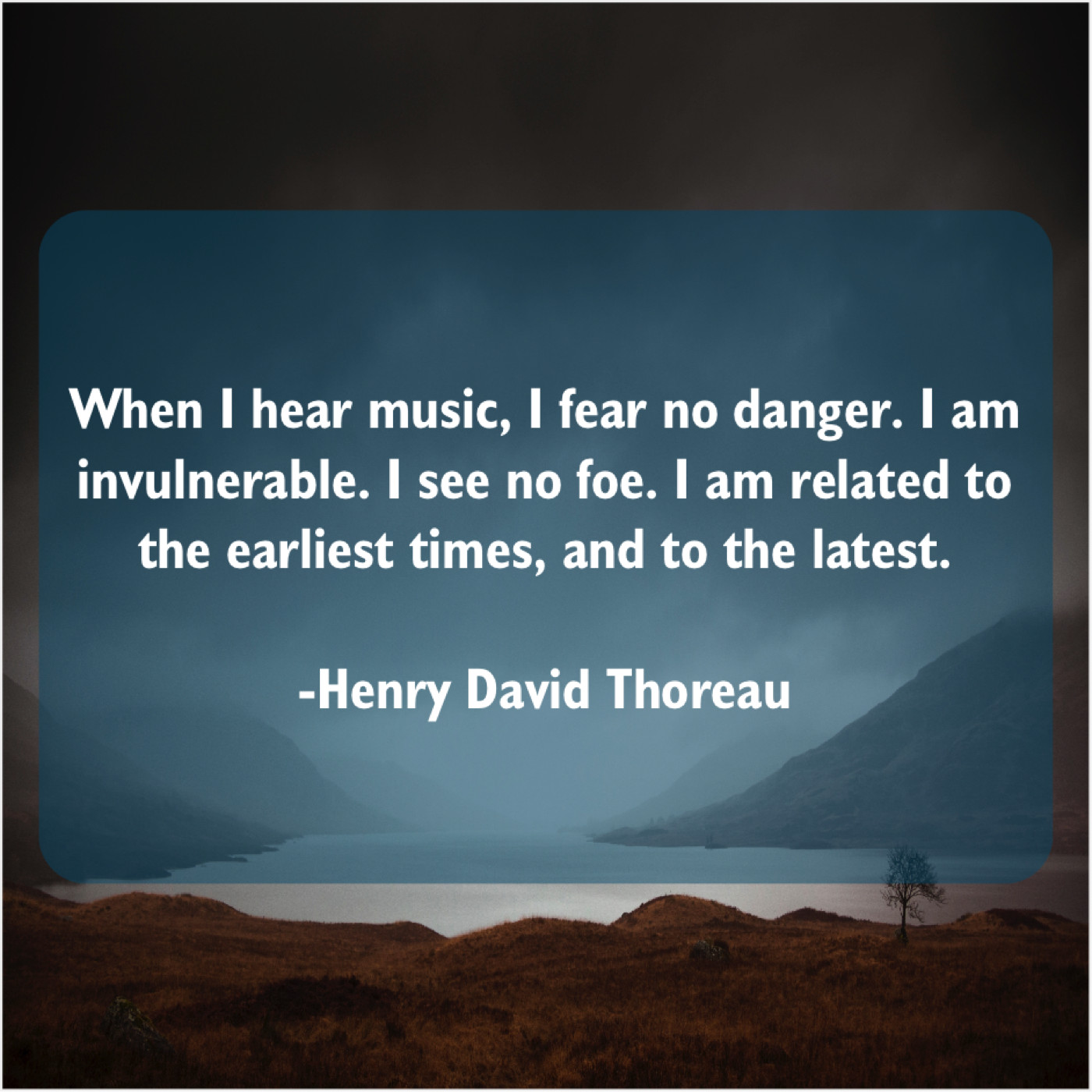 Henry David Thoreau Henry David Thoreau – When I hear music, I… February 16, 2019 admin “When I hear music, I fear no danger. I am invulnerable. I see no foe. I am related to the earliest times, and to the latest.”-Henry David Thoreau
