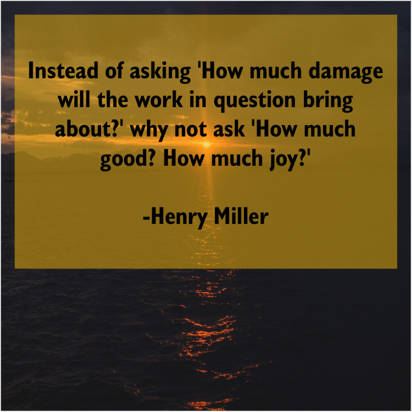 Henry Miller Henry Miller – Instead of asking ‘How much… March 7, 2019 admin “Instead of asking ‘How much damage will the work in question bring about?’ why not ask ‘How much good? How much joy?'”-Henry Miller