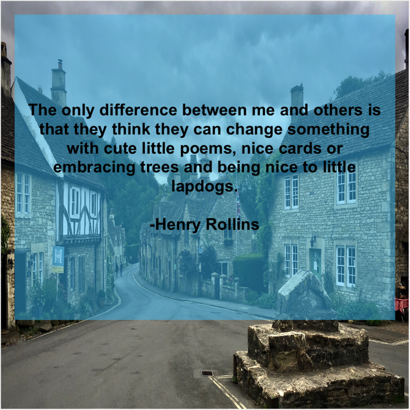 Henry Rollins Henry Rollins – The only difference between me… May 21, 2019 admin “The only difference between me and others is that they think they can change something with cute little poems, nice cards or embracing trees and being nice to little lapdogs.”-Henry Rollins