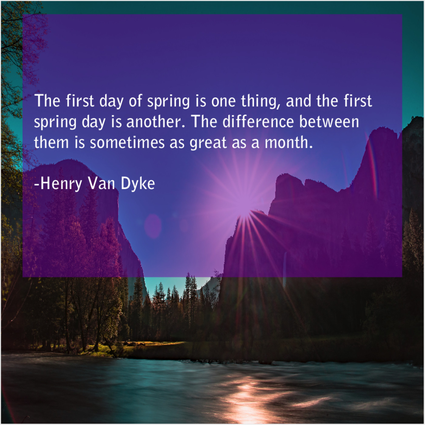 Henry Van Dyke Henry Van Dyke – The first day of spring… August 14, 2019 admin “The first day of spring is one thing, and the first spring day is another. The difference between them is sometimes as great as a month.”-Henry Van Dyke