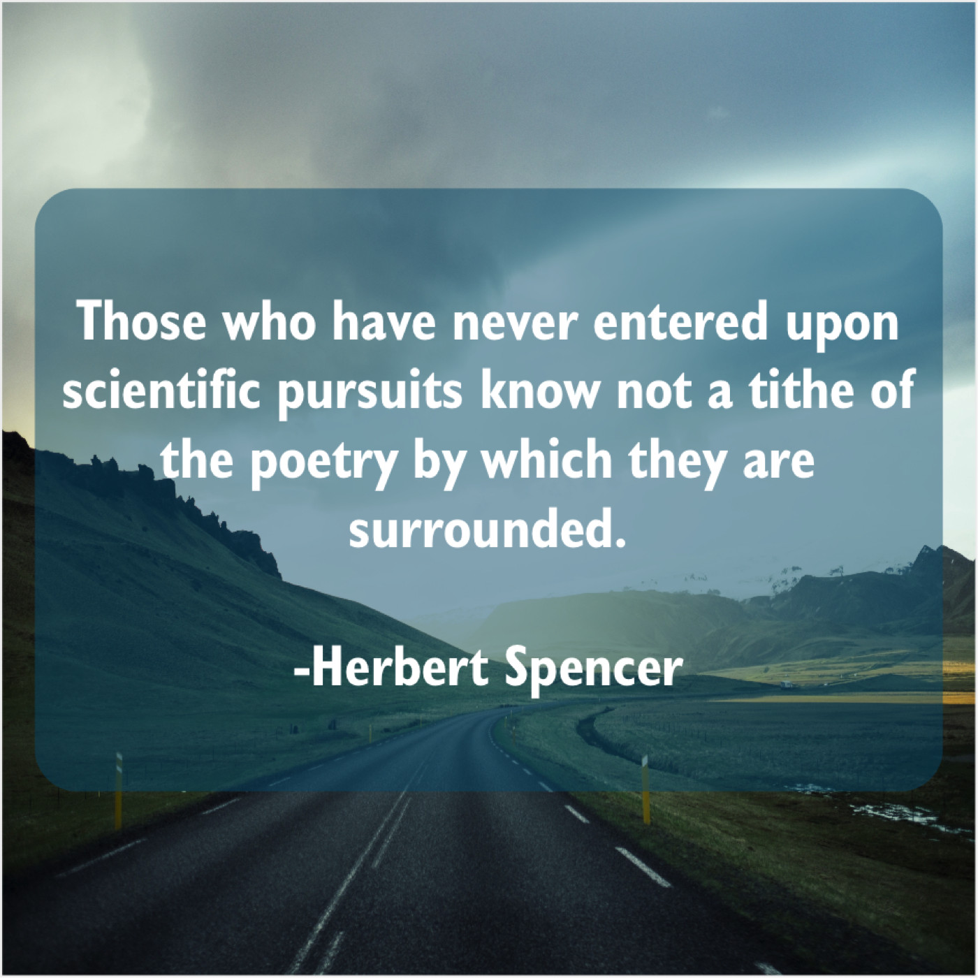 Herbert Spencer Herbert Spencer – Those who have never entered… November 18, 2018 admin “Those who have never entered upon scientific pursuits know not a tithe of the poetry by which they are surrounded.”-Herbert Spencer
