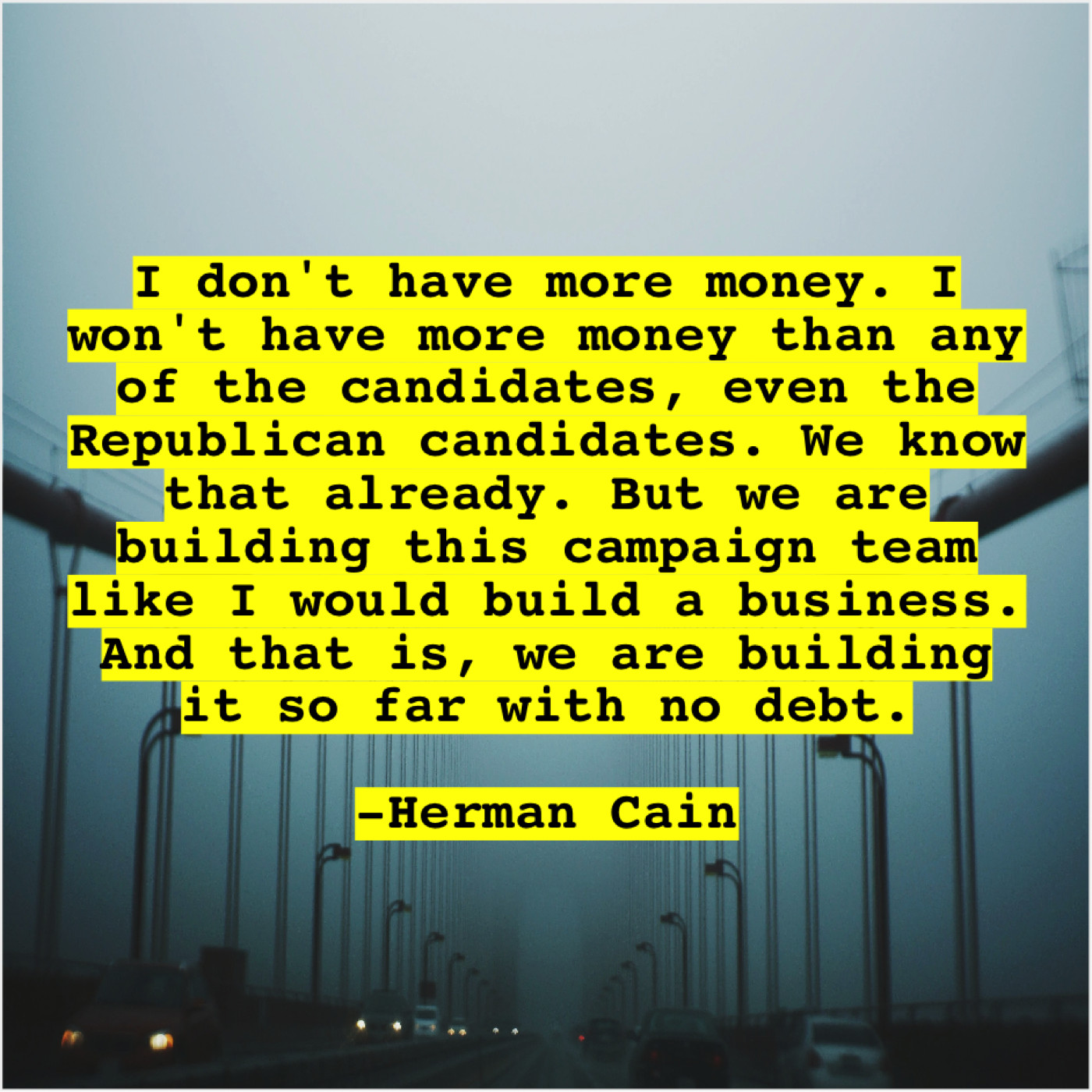 “I don’t have more money. I won’t have more money than any of the candidates, even the Republican candidates. We know that already. But we are building this campaign team like I would build a business. And that is, we are building it so far with no debt.”