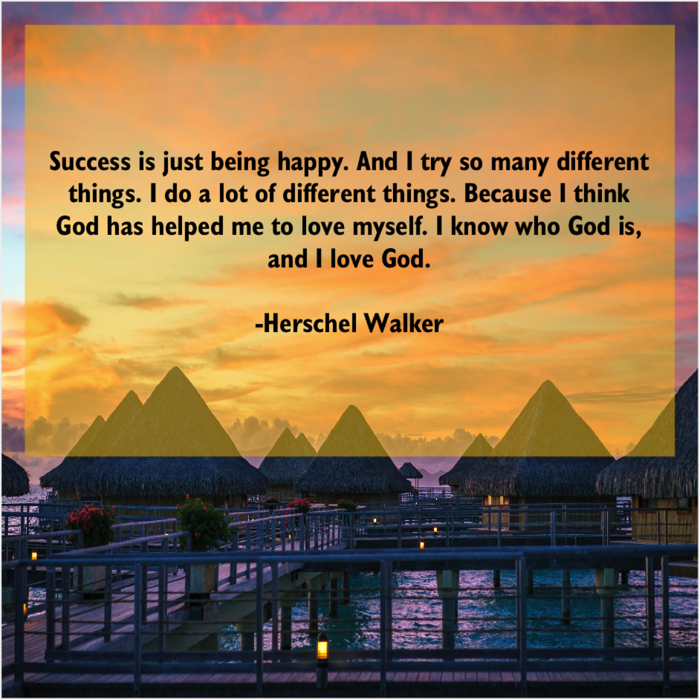 Herschel Walker Herschel Walker – Success is just being happy… April 13, 2019 admin “Success is just being happy. And I try so many different things. I do a lot of different things. Because I think God has helped me to love myself. I know who God is, and I love God.”-Herschel Walker