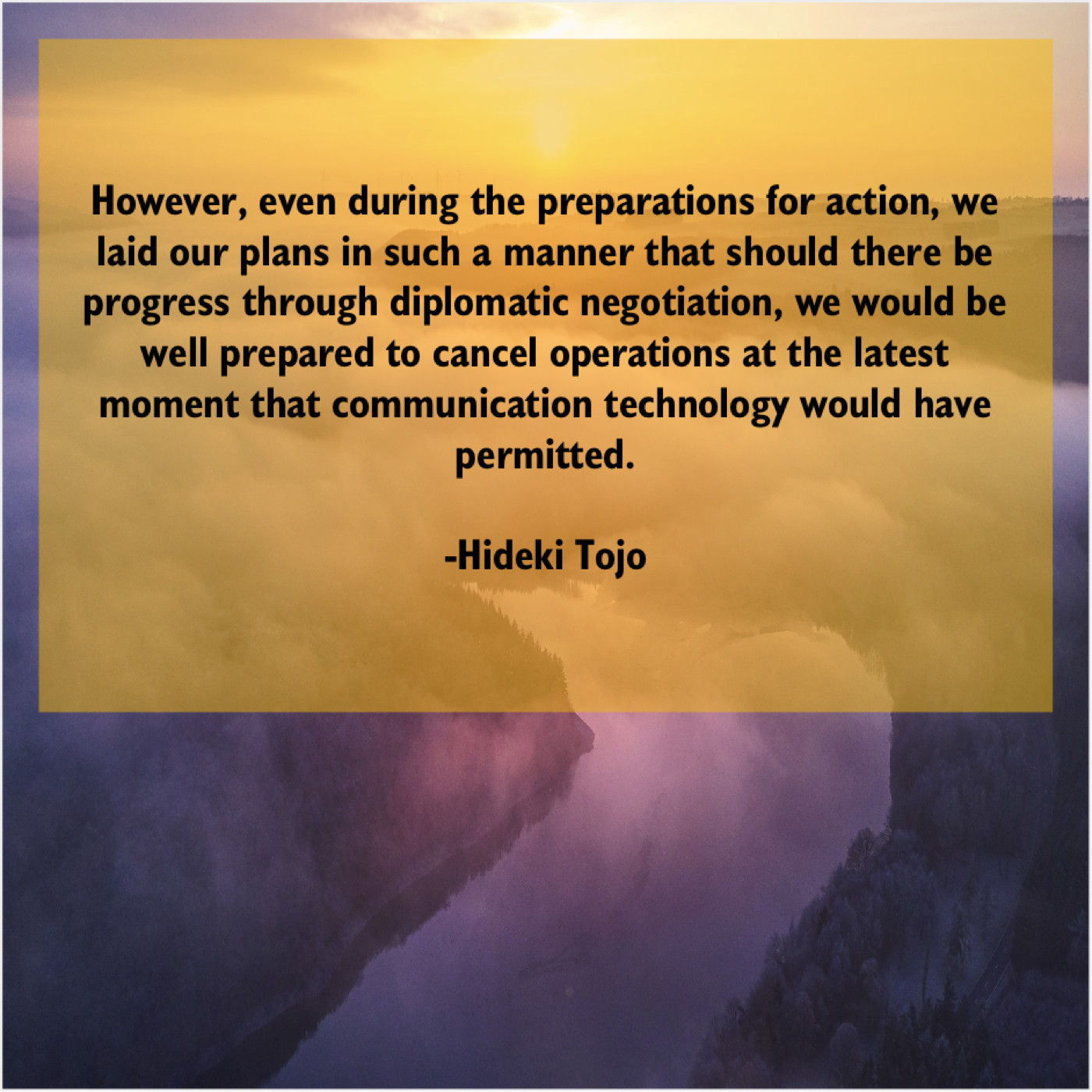 “However, even during the preparations for action, we laid our plans in such a manner that should there be progress through diplomatic negotiation, we would be well prepared to cancel operations at the latest moment that communication technology would have permitted.”