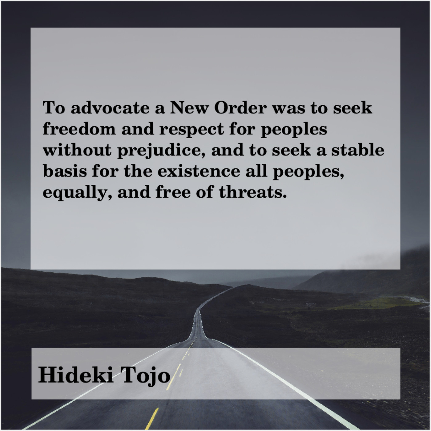 Hideki Tojo Hideki Tojo – To advocate a New Order… March 9, 2019 admin “To advocate a New Order was to seek freedom and respect for peoples without prejudice, and to seek a stable basis for the existence all peoples, equally, and free of threats.”-Hideki Tojo