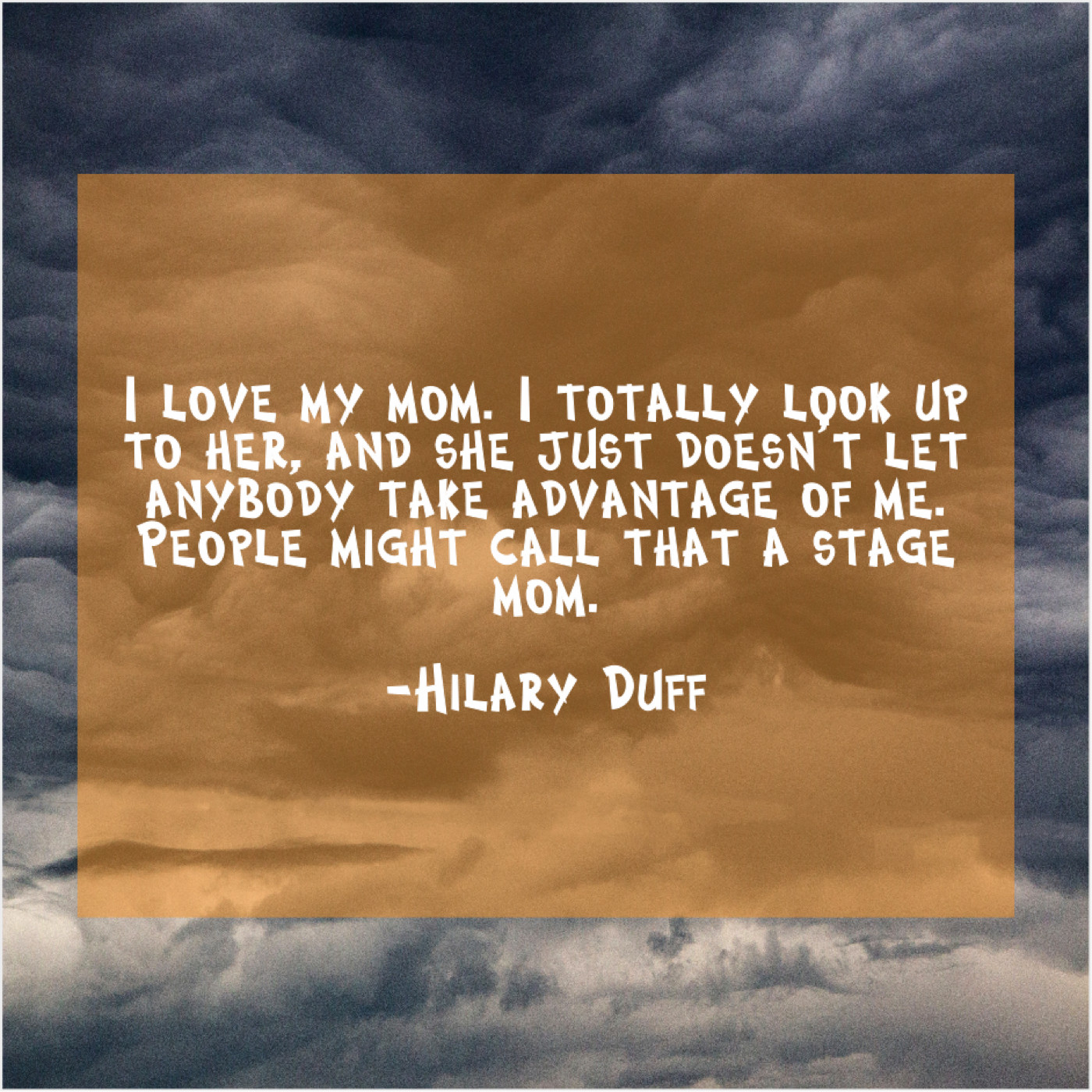 Hilary Duff Hilary Duff – I love my mom. I… June 11, 2019 admin “I love my mom. I totally look up to her, and she just doesn’t let anybody take advantage of me. People might call that a stage mom.”-Hilary Duff