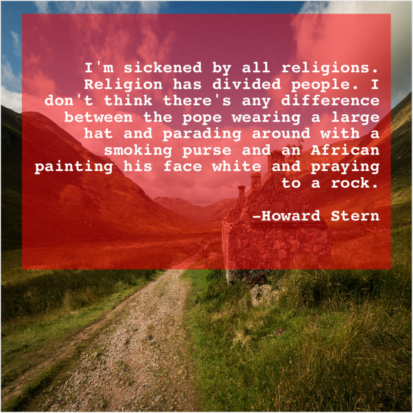 “I’m sickened by all religions. Religion has divided people. I don’t think there’s any difference between the pope wearing a large hat and parading around with a smoking purse and an African painting his face white and praying to a rock.”