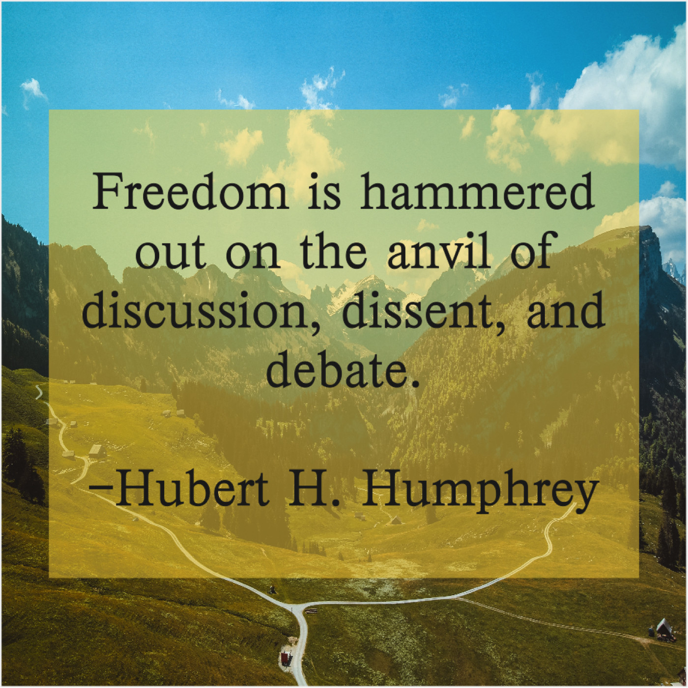 Hubert H. Humphrey Hubert H. Humphrey – Freedom is hammered out on… January 14, 2019 admin “Freedom is hammered out on the anvil of discussion, dissent, and debate.”-Hubert H. Humphrey