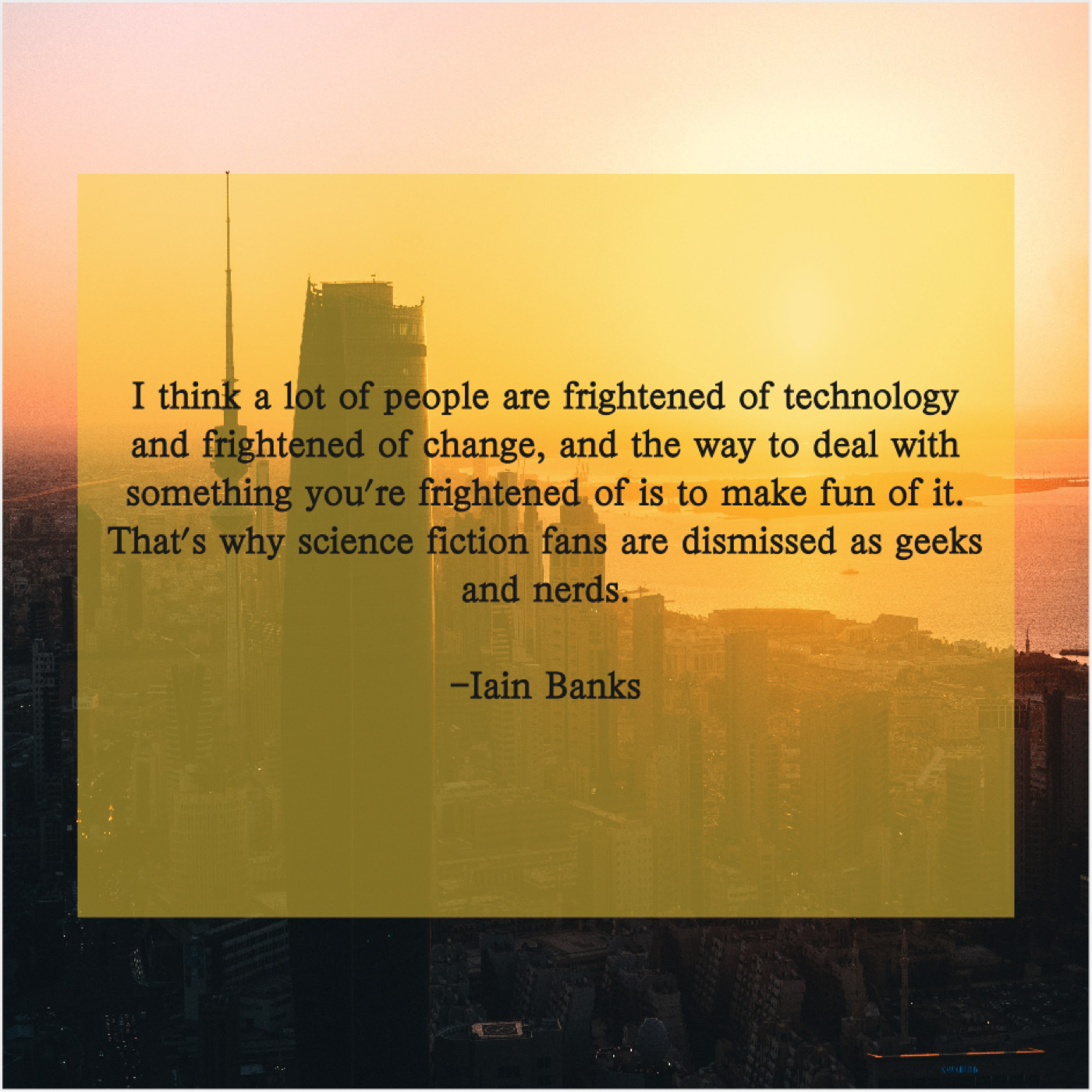 Iain Banks Iain Banks – I think a lot of… March 9, 2019 admin “I think a lot of people are frightened of technology and frightened of change, and the way to deal with something you’re frightened of is to make fun of it. That’s why science fiction fans are dismissed as geeks and nerds.”-Iain Banks
