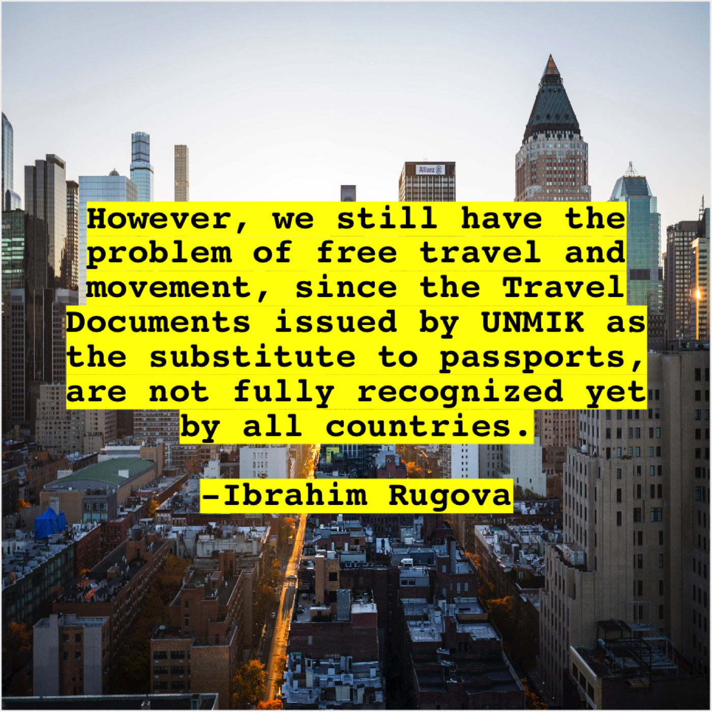 Ibrahim Rugova Ibrahim Rugova – However, we still have the… March 18, 2019 admin “However, we still have the problem of free travel and movement, since the Travel Documents issued by UNMIK as the substitute to passports, are not fully recognized yet by all countries.”-Ibrahim Rugova