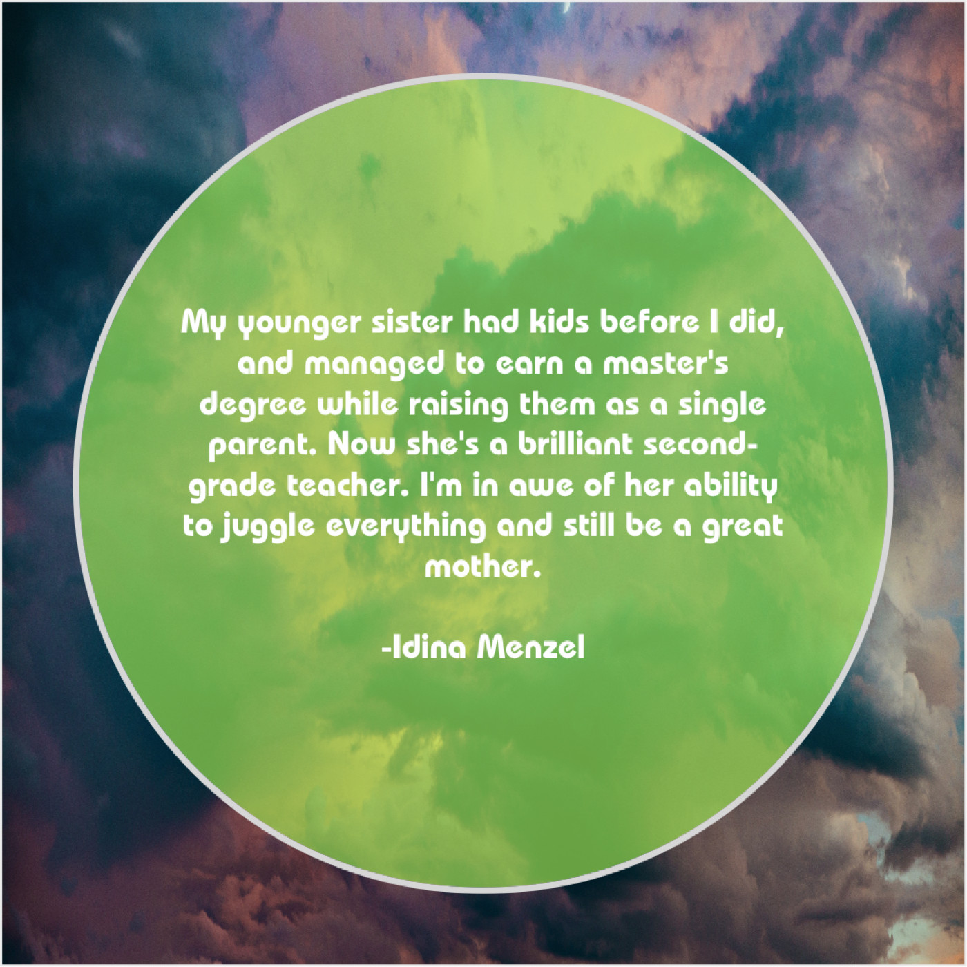 “My younger sister had kids before I did, and managed to earn a master’s degree while raising them as a single parent. Now she’s a brilliant second-grade teacher. I’m in awe of her ability to juggle everything and still be a great mother.”