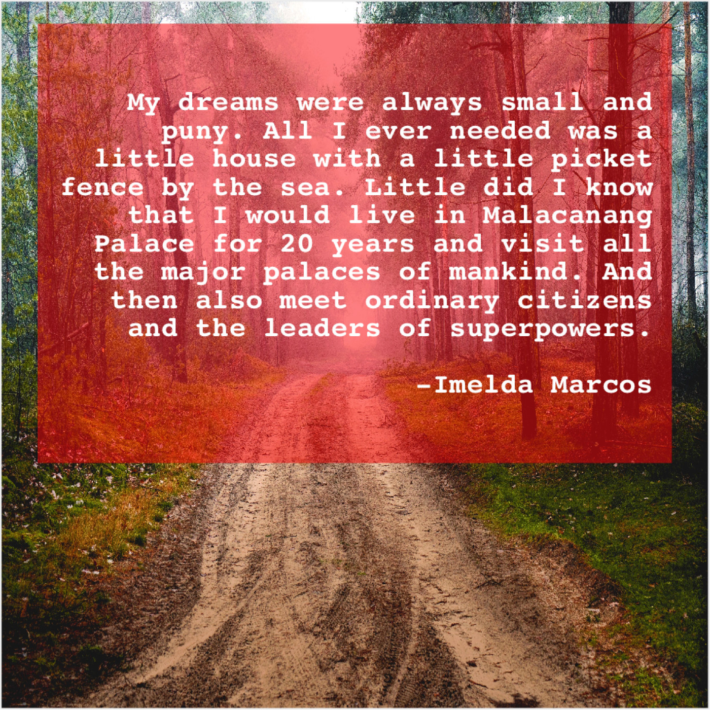 “My dreams were always small and puny. All I ever needed was a little house with a little picket fence by the sea. Little did I know that I would live in Malacanang Palace for 20 years and visit all the major palaces of mankind. And then also meet ordinary citizens and the leaders of superpowers.”
