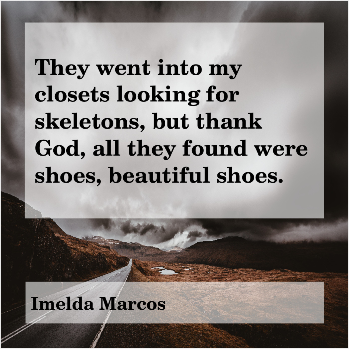 Imelda Marcos Imelda Marcos – They went into my closets… August 27, 2019 admin “They went into my closets looking for skeletons, but thank God, all they found were shoes, beautiful shoes.”-Imelda Marcos