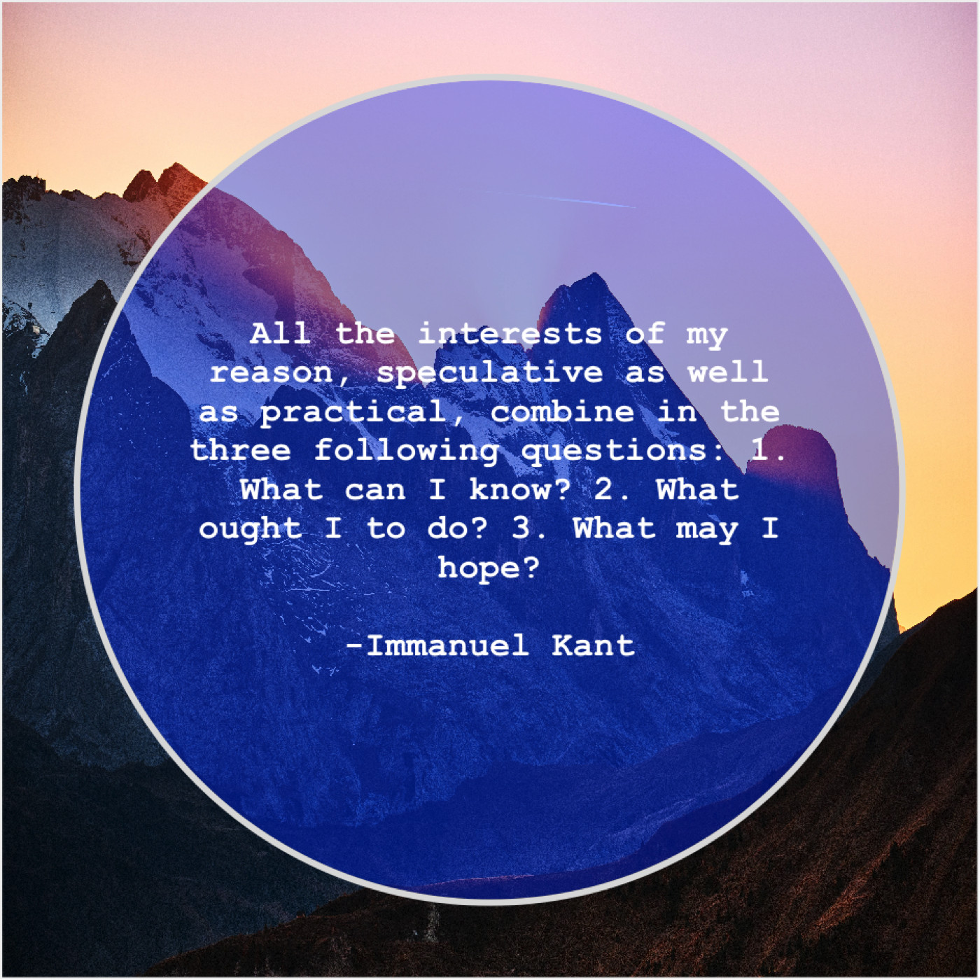 Immanuel Kant Immanuel Kant – All the interests of my… January 5, 2019 admin “All the interests of my reason, speculative as well as practical, combine in the three following questions: 1. What can I know? 2. What ought I to do? 3. What may I hope?”-Immanuel Kant