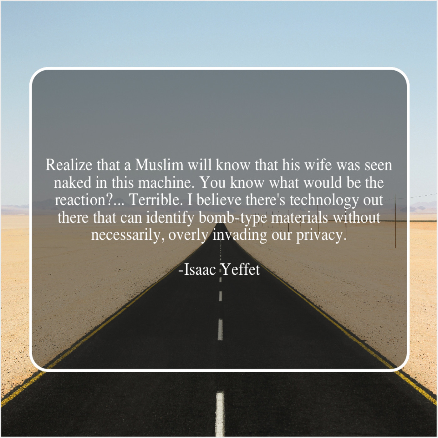 “Realize that a Muslim will know that his wife was seen naked in this machine. You know what would be the reaction?… Terrible. I believe there’s technology out there that can identify bomb-type materials without necessarily, overly invading our privacy.”