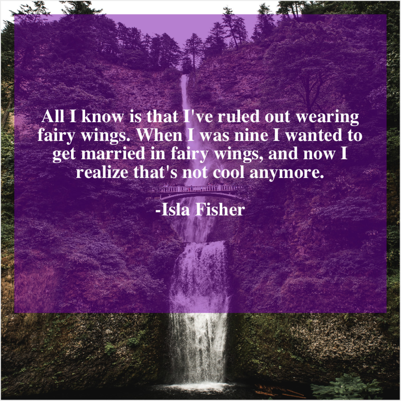 Isla Fisher Isla Fisher – All I know is that… December 16, 2018 admin “All I know is that I’ve ruled out wearing fairy wings. When I was nine I wanted to get married in fairy wings, and now I realize that’s not cool anymore.”-Isla Fisher