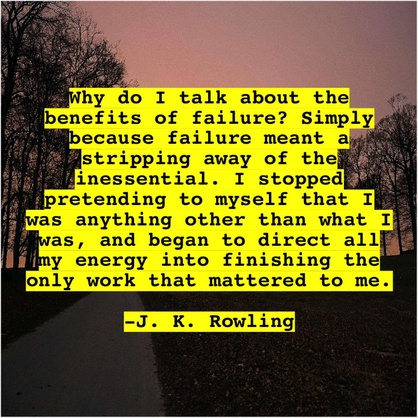 “Why do I talk about the benefits of failure? Simply because failure meant a stripping away of the inessential. I stopped pretending to myself that I was anything other than what I was, and began to direct all my energy into finishing the only work that mattered to me.”