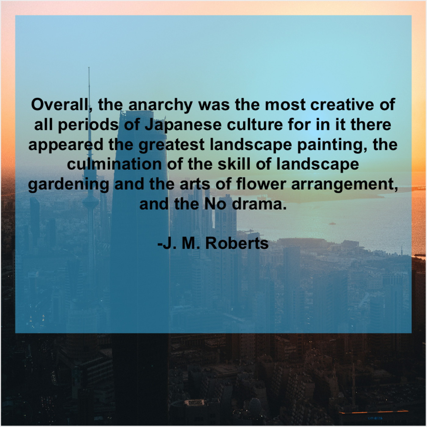 “Overall, the anarchy was the most creative of all periods of Japanese culture for in it there appeared the greatest landscape painting, the culmination of the skill of landscape gardening and the arts of flower arrangement, and the No drama.”