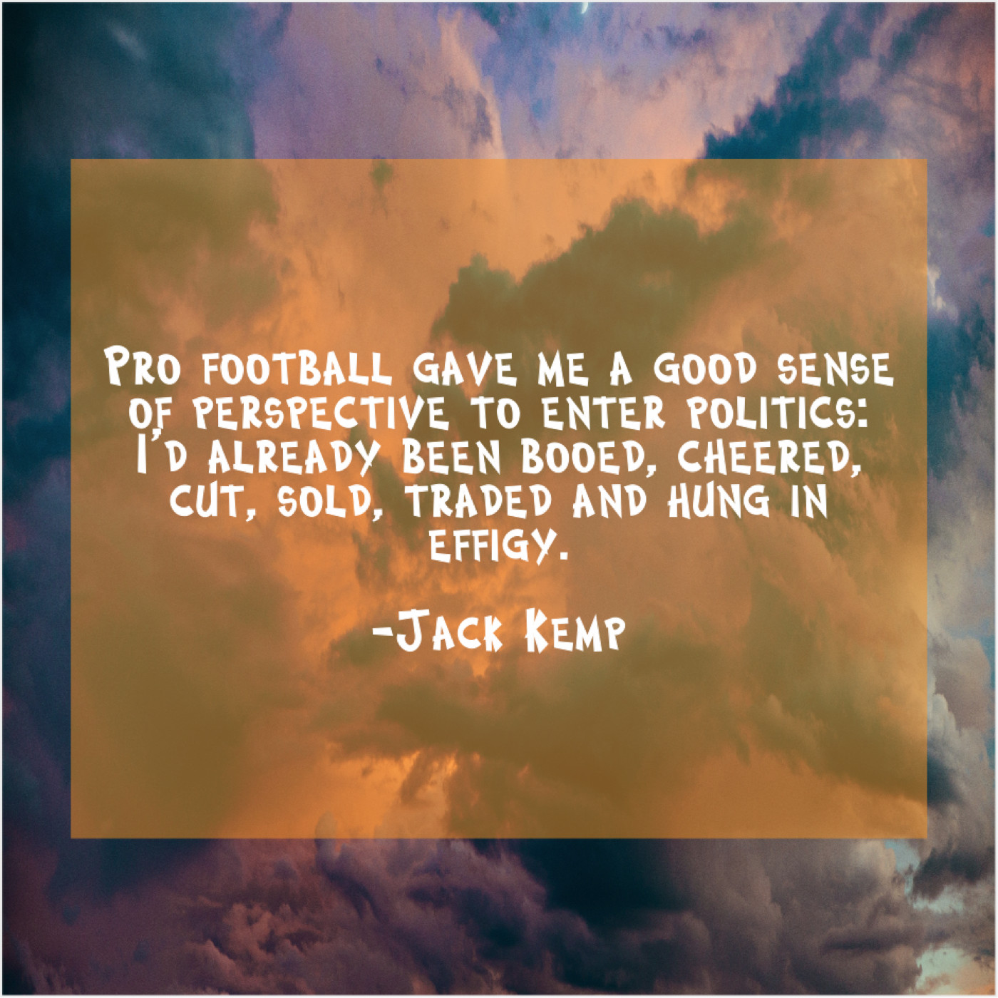 Jack Kemp Jack Kemp – Pro football gave me a… March 12, 2019 admin “Pro football gave me a good sense of perspective to enter politics: I’d already been booed, cheered, cut, sold, traded and hung in effigy.”-Jack Kemp