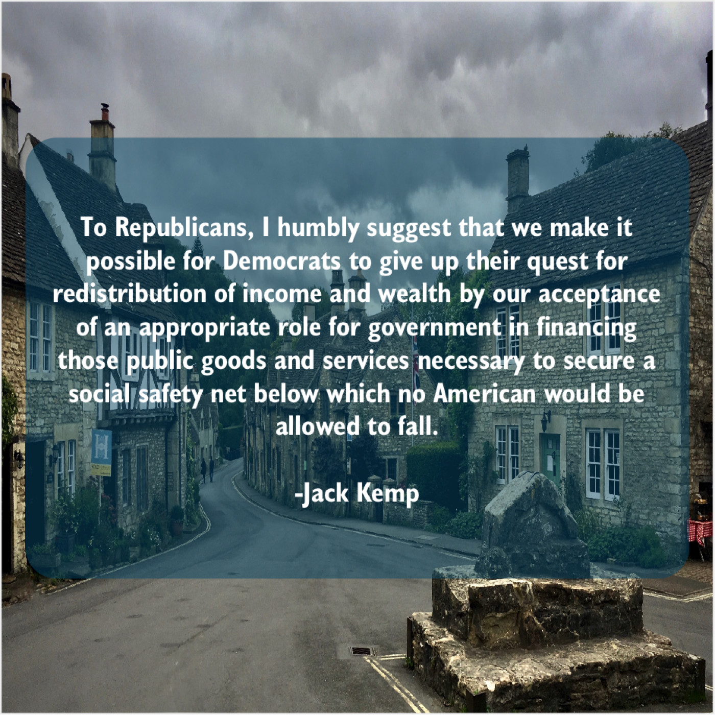 “To Republicans, I humbly suggest that we make it possible for Democrats to give up their quest for redistribution of income and wealth by our acceptance of an appropriate role for government in financing those public goods and services necessary to secure a social safety net below which no American would be allowed to fall.”