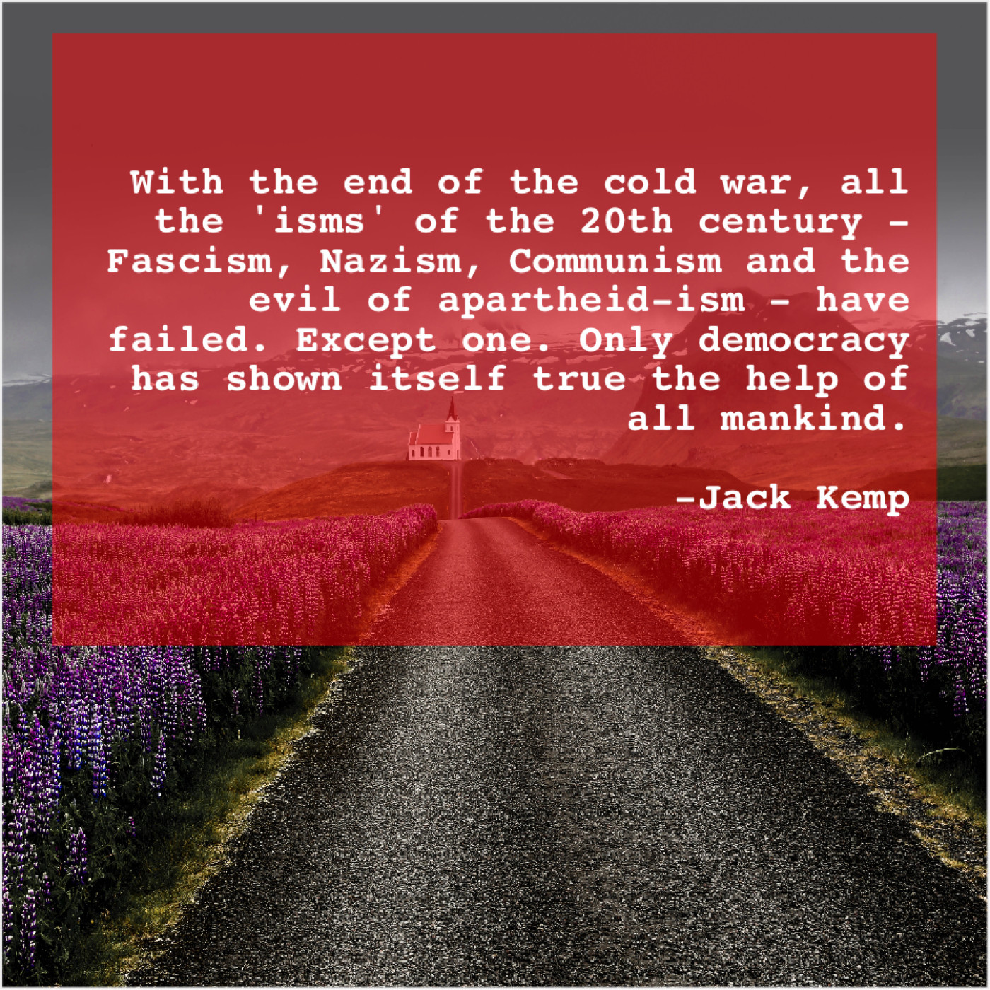 Jack Kemp Jack Kemp – With the end of the… February 9, 2019 admin “With the end of the cold war, all the ‘isms’ of the 20th century – Fascism, Nazism, Communism and the evil of apartheid-ism – have failed. Except one. Only democracy has shown itself true the help of all mankind.”-Jack Kemp