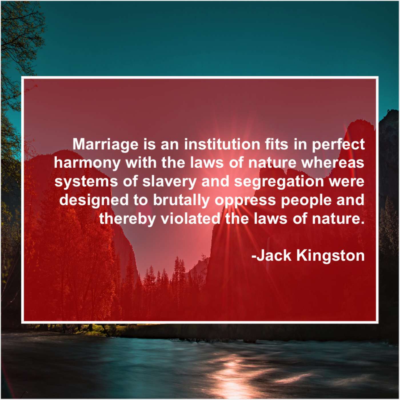 Jack Kingston Jack Kingston – Marriage is an institution fits… July 20, 2019 admin “Marriage is an institution fits in perfect harmony with the laws of nature whereas systems of slavery and segregation were designed to brutally oppress people and thereby violated the laws of nature.”-Jack Kingston