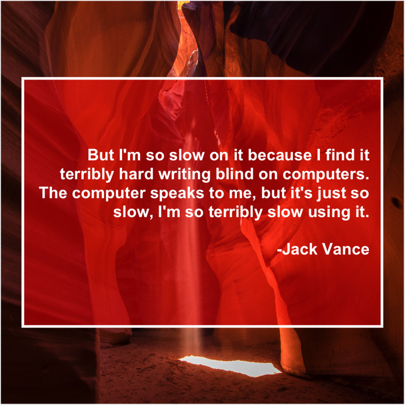 Jack Vance Jack Vance – But I’m so slow on… September 15, 2019 admin “But I’m so slow on it because I find it terribly hard writing blind on computers. The computer speaks to me, but it’s just so slow, I’m so terribly slow using it.”-Jack Vance