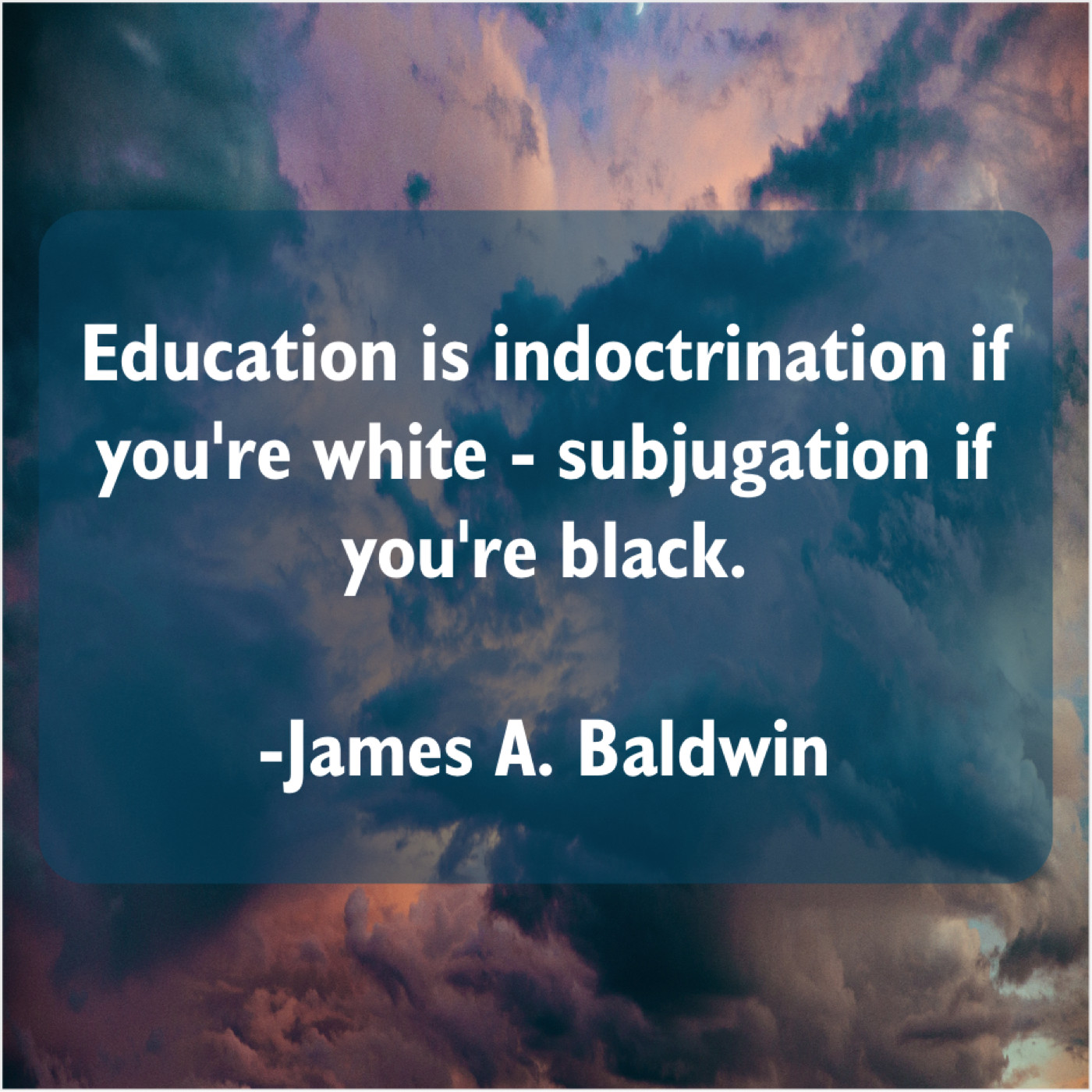 James A. Baldwin James A. Baldwin – Education is indoctrination if you’re… May 31, 2019 admin “Education is indoctrination if you’re white – subjugation if you’re black.”-James A. Baldwin