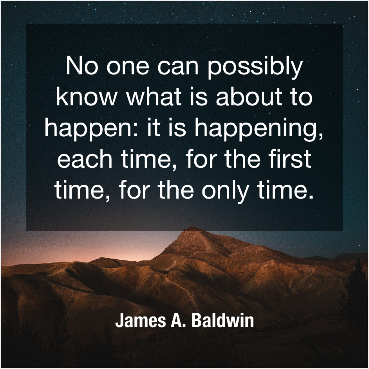 James A. Baldwin James A. Baldwin – No one can possibly know… June 4, 2019 admin “No one can possibly know what is about to happen: it is happening, each time, for the first time, for the only time.”-James A. Baldwin