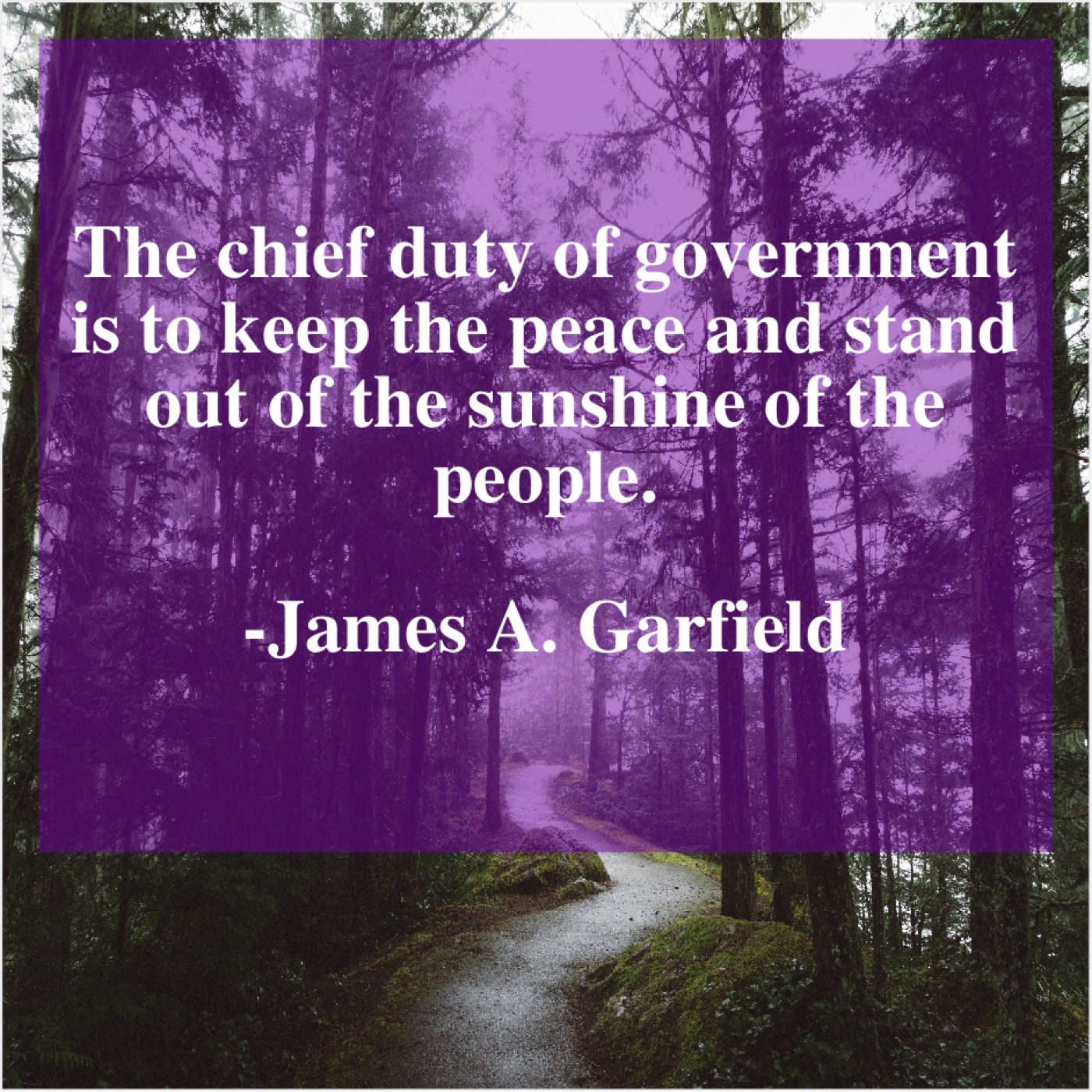 James A. Garfield James A. Garfield – The chief duty of government… September 2, 2019 admin “The chief duty of government is to keep the peace and stand out of the sunshine of the people.”-James A. Garfield