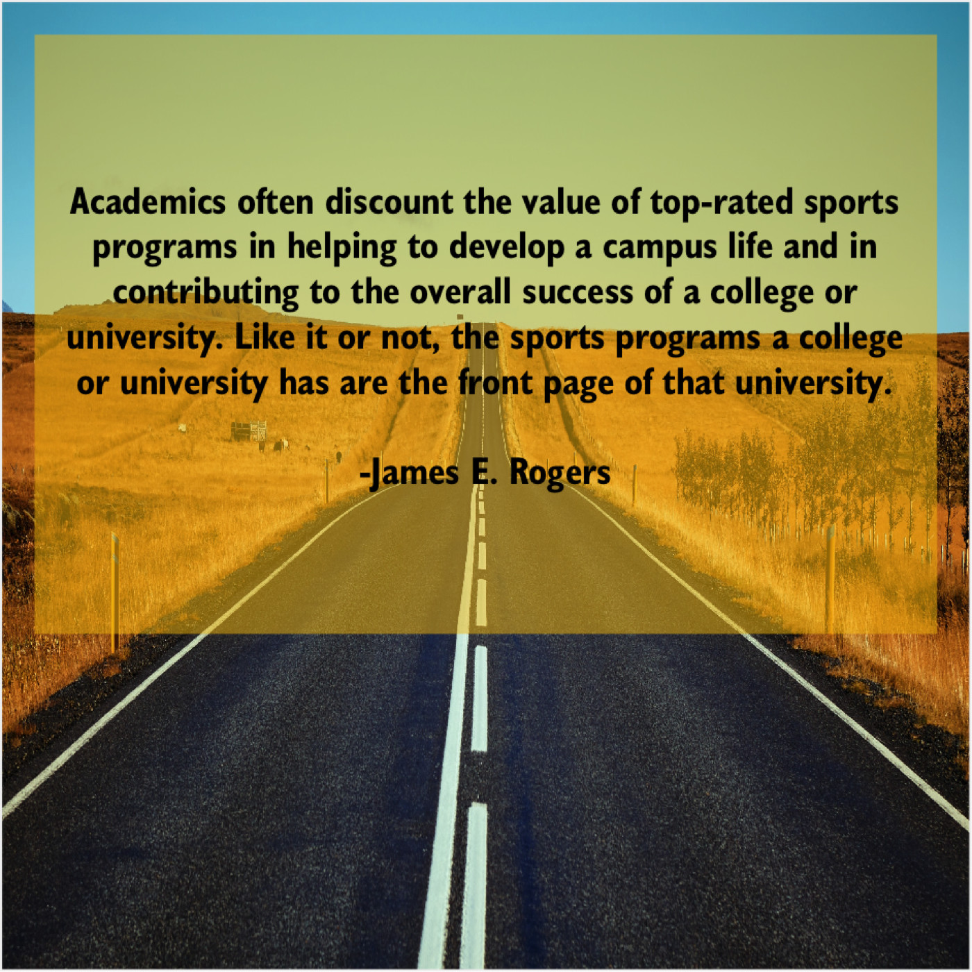“Academics often discount the value of top-rated sports programs in helping to develop a campus life and in contributing to the overall success of a college or university. Like it or not, the sports programs a college or university has are the front page of that university.”
